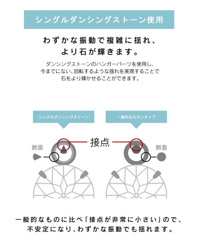 通常石をぶら下げるのは1点だけですが、Dancing Stoneは2点でぶら下げ、更に石の周りを地金でカバーし、爪でしっかり留めている(石に穴を開けてないので、石の本質は変わりません)ため、瞬くように振動しますが、石が取れることはありません。