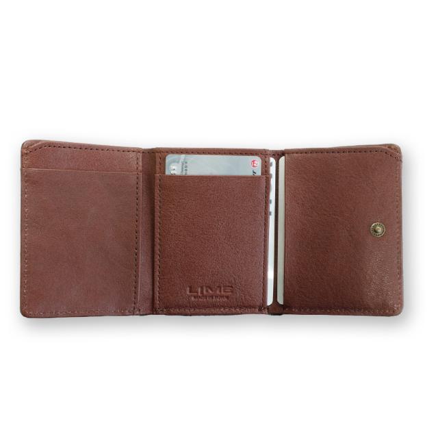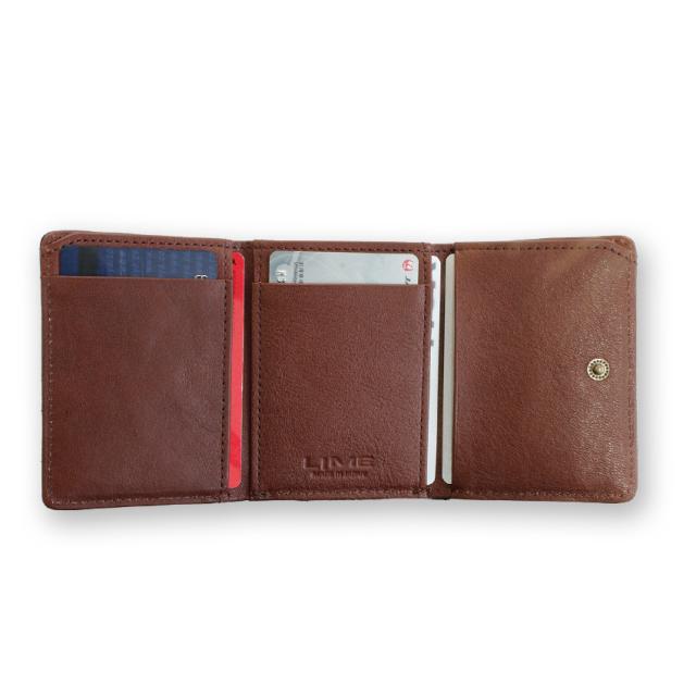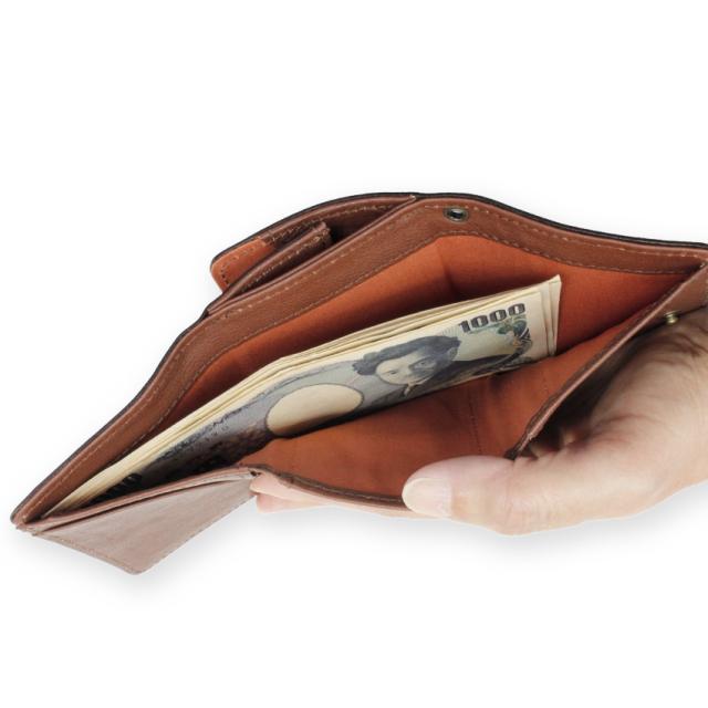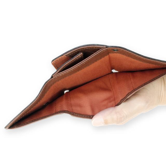 お札、コイン、必要なカード類がしっかりとミニマムに収まる手のひらサイズのコンパクトな三つ折り財布です。