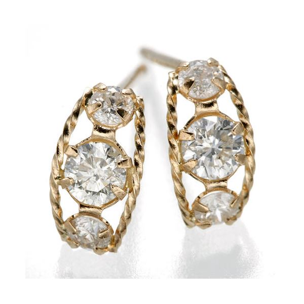 正面から見るとエタニティピアスみたい♪耳の先端で3石のダイヤモンドがキラッと輝き、それを包むK18の地金は縄こちらのようなねじれ加工がほどこされていてデザインが繊細。実際につけてみると「上品、コンサバ、大人の女性」といった言葉が似合う、上品なピアスなんです。
