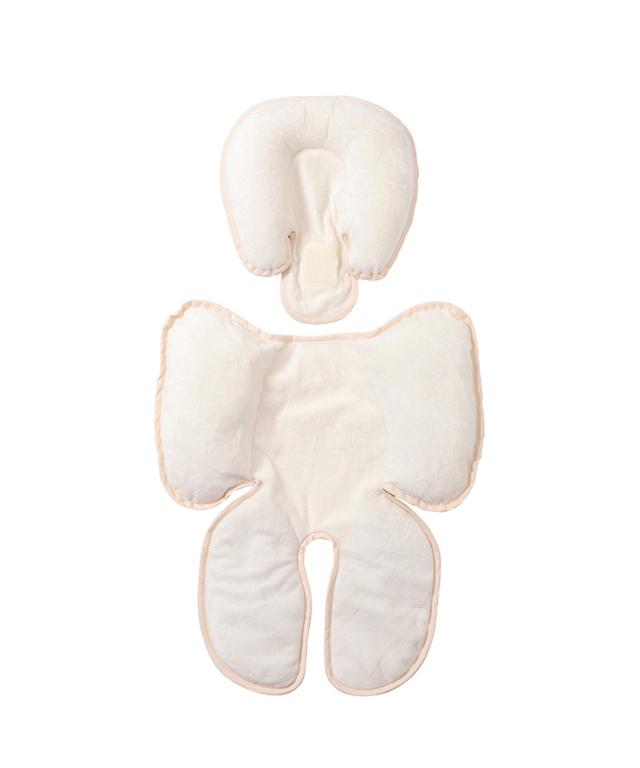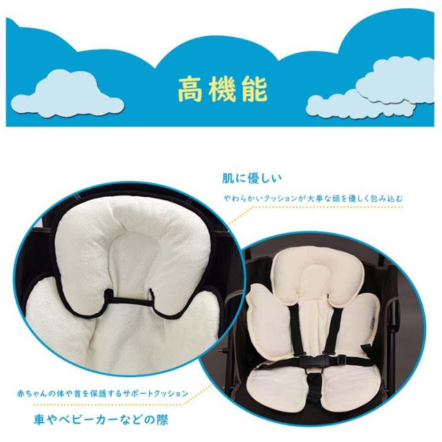 | 赤ちゃんの体を守ります。ふわふわインナークッション。 肌に優しくて、やわらかいクッションが大事な頭を優しく包み込む。 車やベビーカーなどの際、赤ちゃんの体や首を保護するサポートクッション。 ヘッドサポートはマジックテープで簡単に取り外し可能。お子様の成長に合わせて長く使っていただけます。 チャイルドシートやベビーカーの、肩ベルトや股ベルトの邪魔にならない形になっていて、どちらでも使える。 汚れたら洗濯機で洗えるのも嬉しいポイント♪長くお使いいただけます。 | |