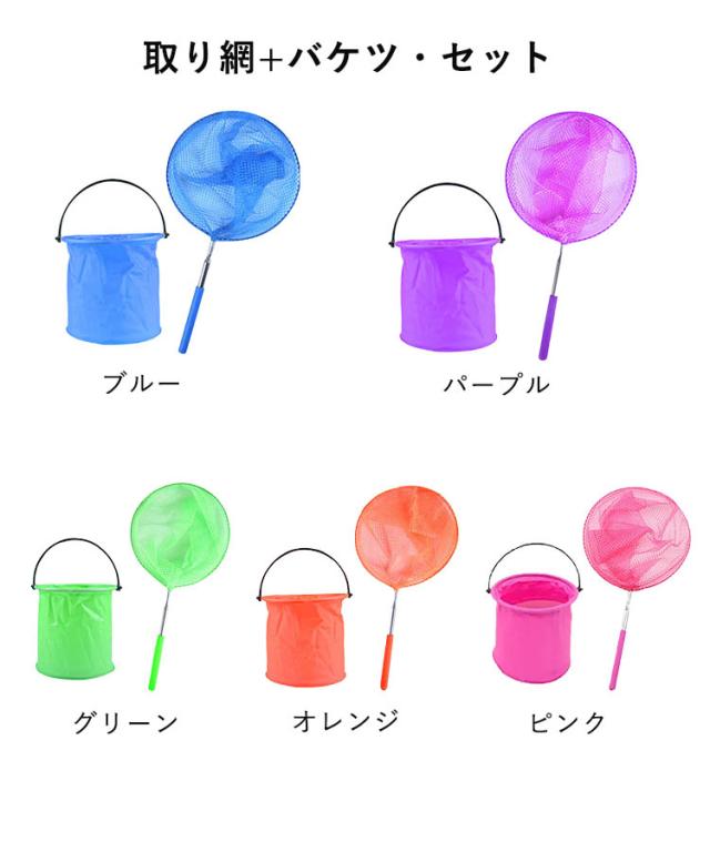 | 色 | 【取り網】ブルー+イエロー 【取り網】ブルー+レッド 【取り網】ブルー+グリーン 【取り網】ブルー+ピンク 【取り網】ブルー+オレンジ 【取り網】グリーン+ピンク 【取り網】グリーン+レッド 【取り網】グリーン+パープル 【取り網】グリーン+オレンジ 【取り網+バケツ】ブルー 【取り網+バケツ】パープル 【取り網+バケツ】グリーン 【取り網+バケツ】オレンジ 【取り網+バケツ】ピンク |