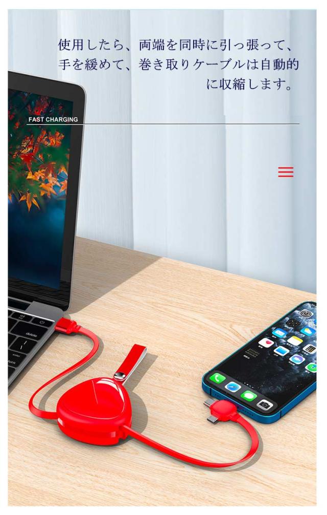 | 3in1 充電ケーブル iphone/android/type-c 3A 20cm-120cmまで、5段階の長さを調整出来ます。 必要な分だけ伸ばして使用出来で、日常のどのような場面においても対応し、接続が可能です。 断線、短路防止を工夫し、根元部にも耐久性を考慮した断線しにくい構造になっています。 最も耐久性優れ素材によって作られて、数千回以上の折り曲げテストに合格しており、そのため劣化しにくく、長年にわたり御愛用頂けます。 両端を同時に引っ張って、必要な分だけ伸ばして使用してください。 使用したら、両端を同時に引っ張って、手を緩めて、巻き取りケーブルは自動的に収縮します。 | |