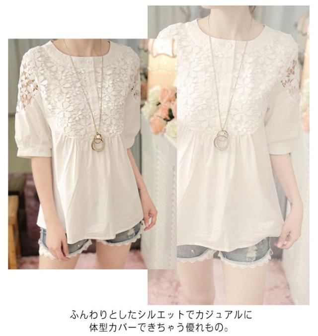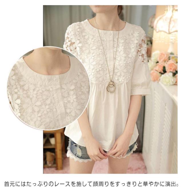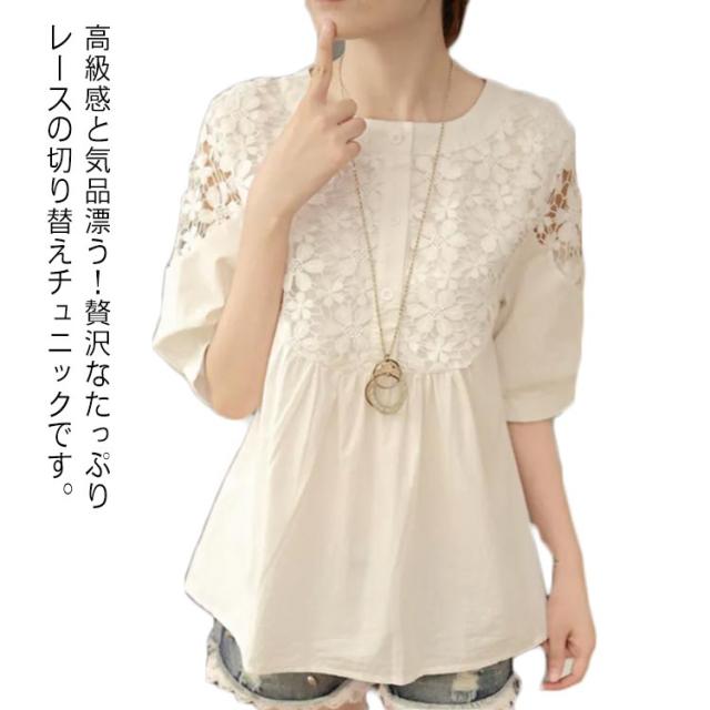 レース チュニック 半袖チュニック レースチュニック 花柄レース 刺? トップス シャツ クルーネック 5分袖 ボリュームスリーブ シースルー レース切り替え フリル フレア ギャザー カットソー 薄手 大人 上品 きれいめ 送料無料