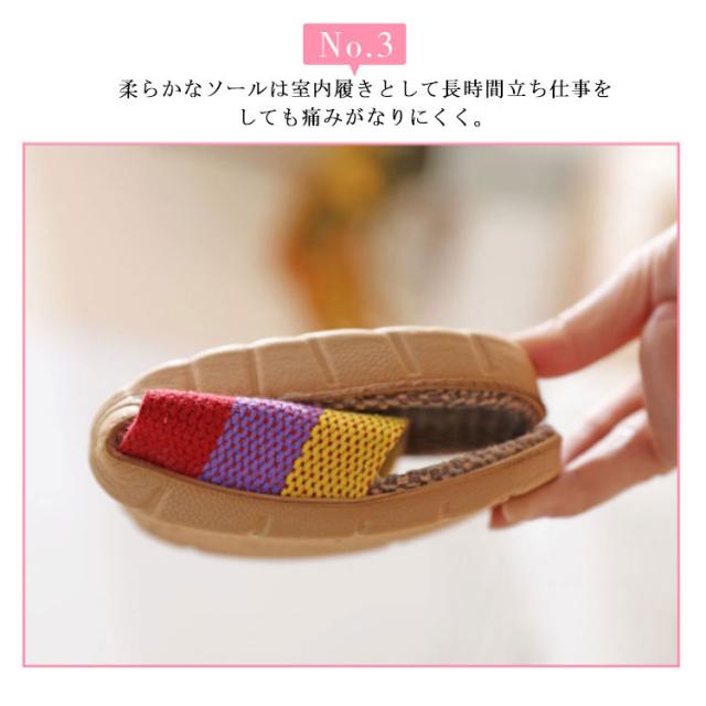 | 履いる人にサラサラと涼しい感じを与える男女兼用なスリッパです。 綿麻混生地なので、通気性がよく、爽やかにお履きいただけます。 ソールは滑り止め加工が付いているので、階段を下りるのに助かっています。 静音タイプですので、マンションなどでも階下を気にされることなく、安心してご使用いただけます。 柔らかなソールは室内履きとして長時間立ち仕事をしても痛みがなりにくく。 | |