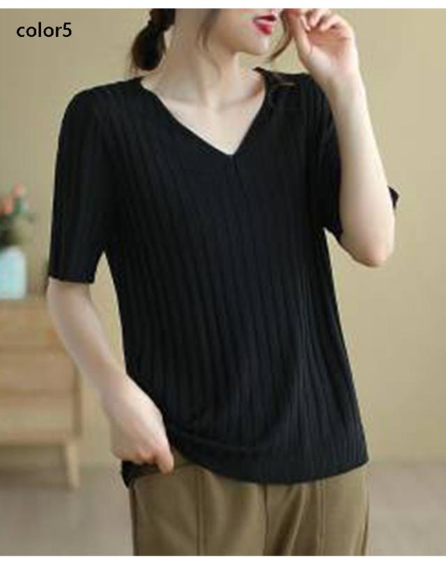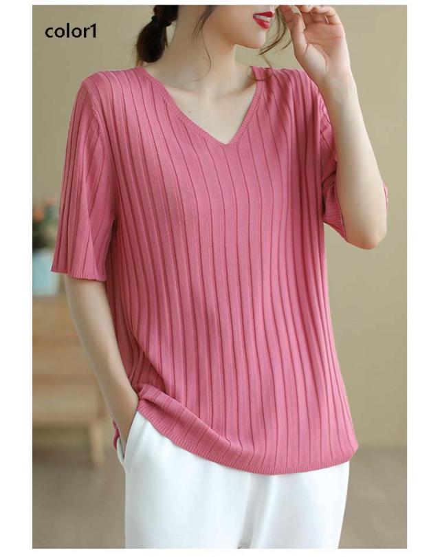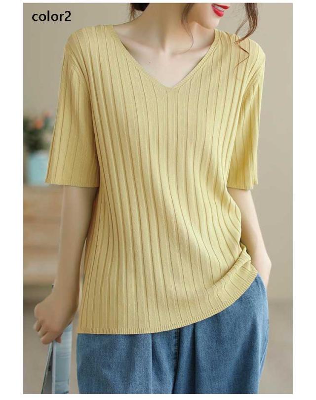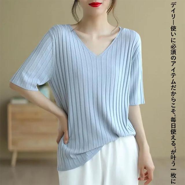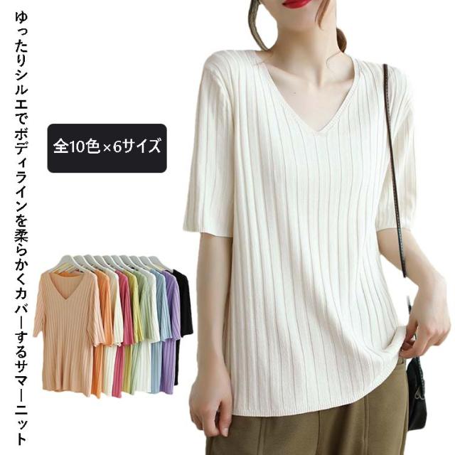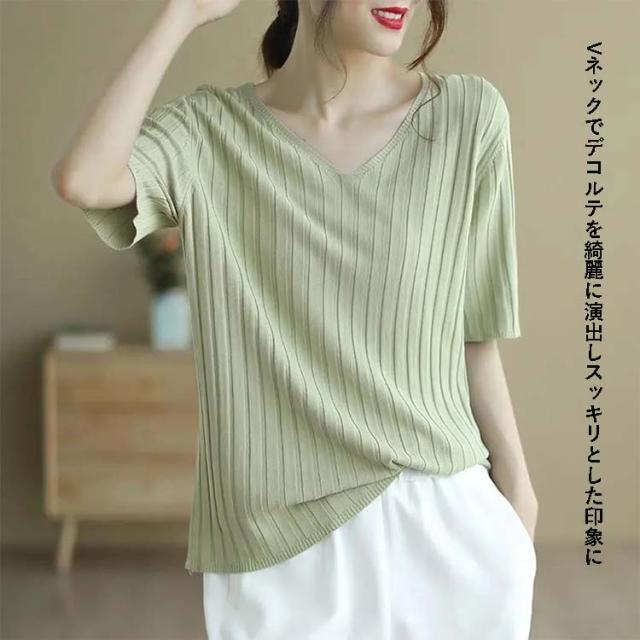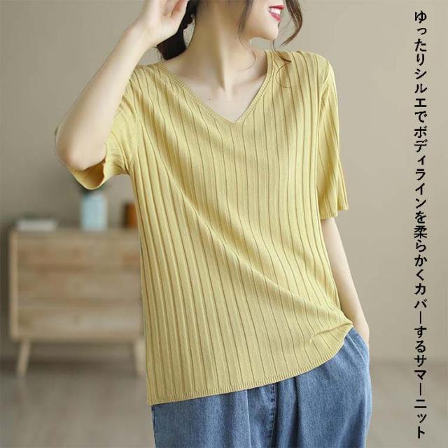 リブニット サマーニット Vネック 半袖 レディース 春 夏 トップス プルオーバー リブ ニット 春 夏 レディース トップス カットソー