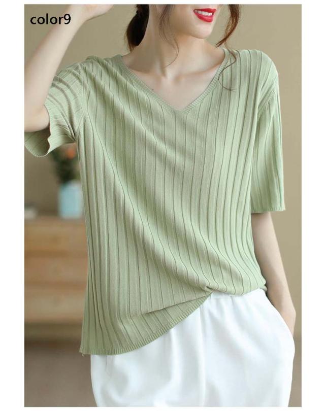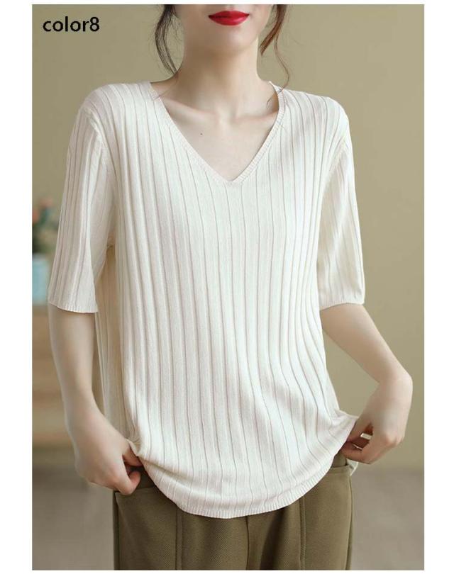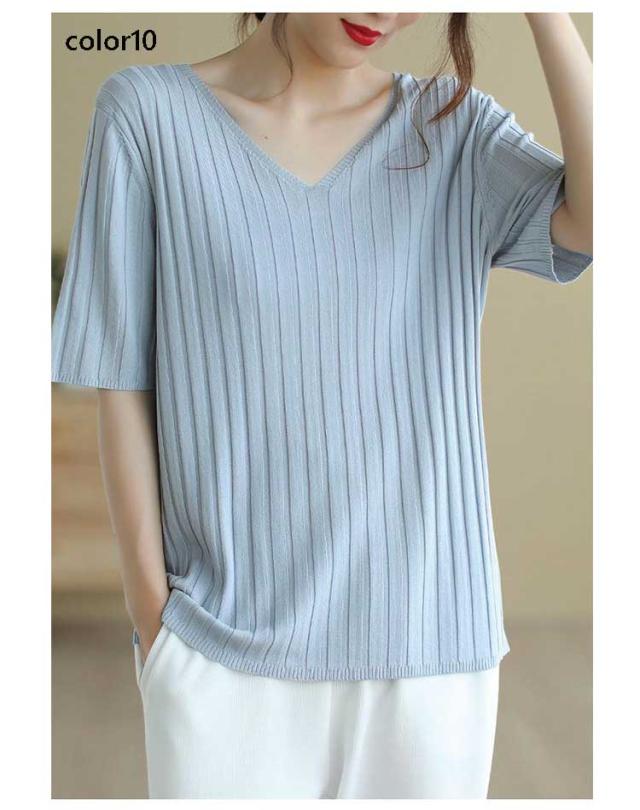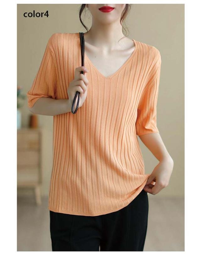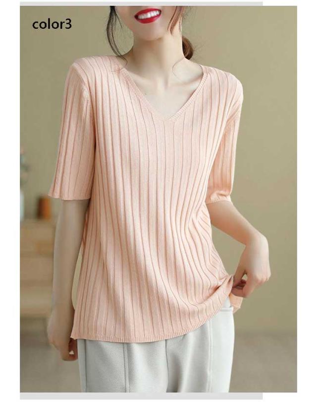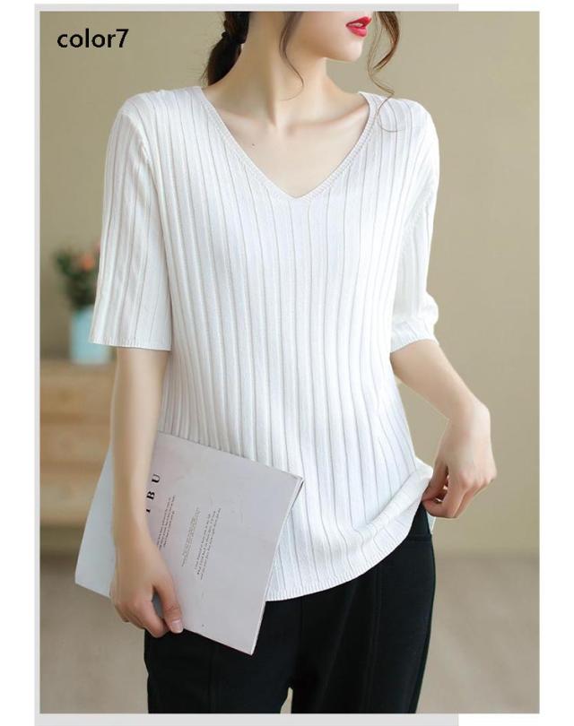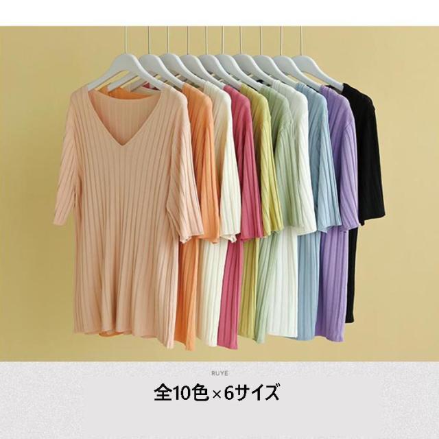リブニット サマーニット Vネック 半袖 レディース 春 夏 トップス プルオーバー リブ ニット 春 夏 レディース トップス カットソー