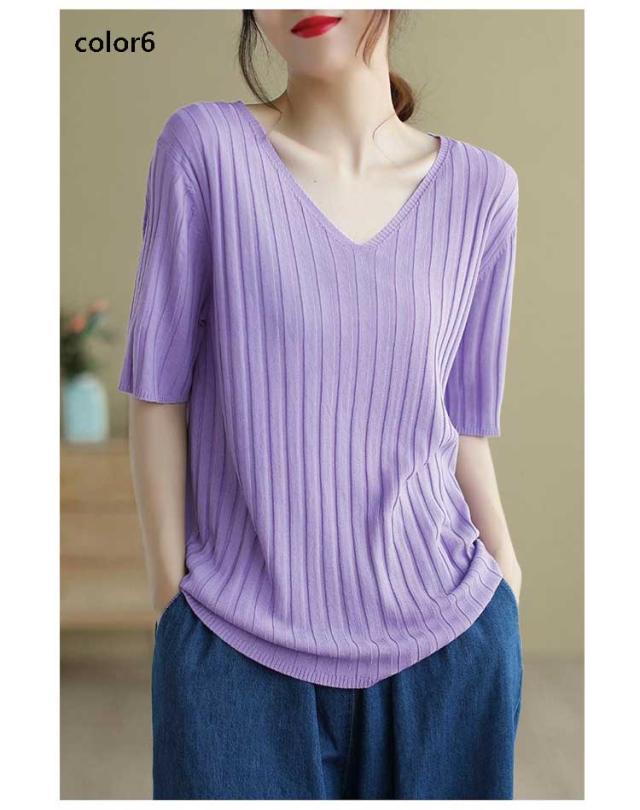 | 全10色×6サイズ ゆったりシルエでボディラインを柔らかくカバーするサマーニット Vネックでデコルテを綺麗に演出しスッキリとした印象に デイリー使いに必須のアイテムだからこそ“毎日使える”が叶う一枚に | |