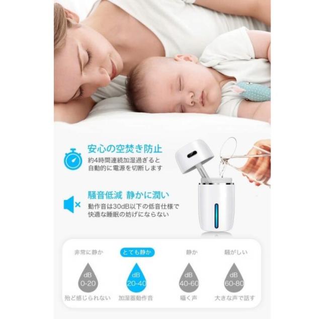【静音加湿/USB給電】静音加湿器、動作音は35dB以下、とても静かで、睡眠を邪魔する心配はありません。USB給電口なので、コンピューターやモバイルバッテリーなどから電源を取れて、とても便利です。