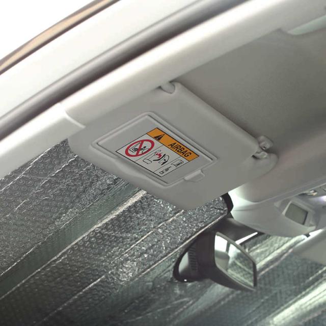 駐車中の強い日差しをさえぎり、車内温度の上昇とダッシュボードや装着品などの劣化を軽減します。また、ダッシュボードが高温になるのを軽減するので、エアコンで効率よく車内の温度を調節でき、ガソリン代も節約できます。紫外線は夏以外も車に影響を与えるので、通年使用をオススメします。