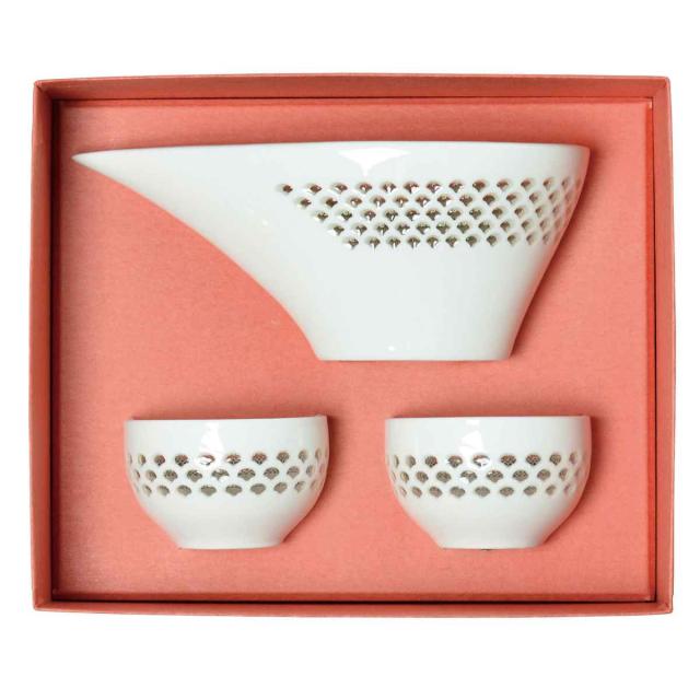 透かし彫りが印象的な片口とぐいのみのセットです。注いだ飲み物が透けて見え、目でも楽しむことができます。普段使いからおもてなしまで幅広くお使いいただけます。ギフトボックス入りなので、大切な方への贈り物にもおすすめです。