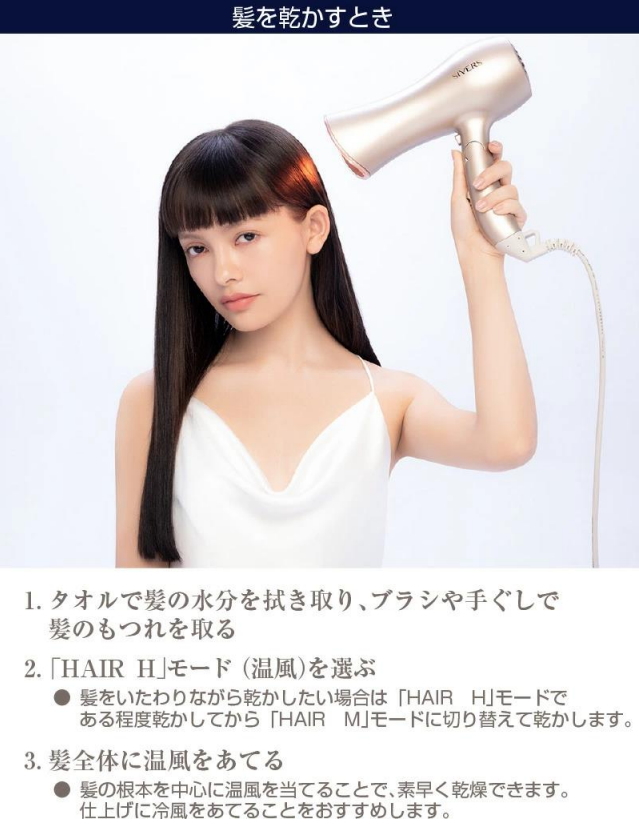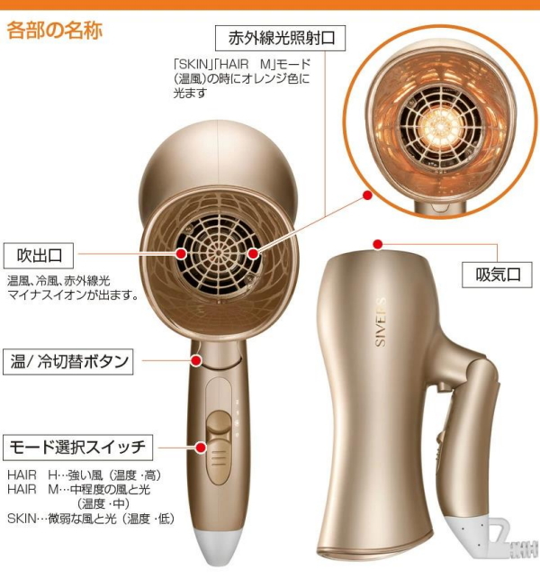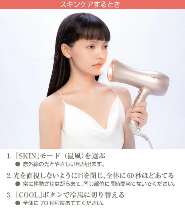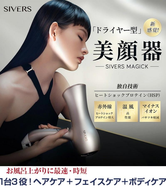 新感覚!全身に使える次世代ドライヤー型光健康美容器。お風呂上りに1台3役!ヘアケア+フェイスケア+ボディケア。使い方は簡単で、SIVERS MAGICKから出る「赤外線」をあびるだけ!このあと冷風をあてるだけという美顔器機能が付いています。
