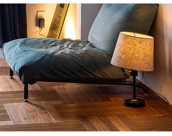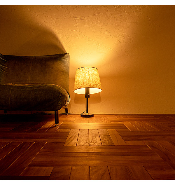 スイッチを入れるとファブリックシェードが光を柔らかく拡散。明るすぎず落ち着いた雰囲気にしてくれます。
