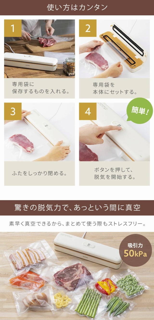 【数量限定 おまけ付】 真空パック機 アイリスオーヤマ 袋 フードシーラー コンパクト 家庭用 本体 真空シーラー 保存 調理 キッチン 真空パック 密閉 低温調理 VPF-S50 ホワイト