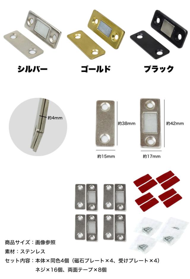 マグネットキャッチ 4個セット 磁気キャッチ ステンレス 薄型 強力 ドア止め金具 家具扉 戸棚 ドアキャッチ DIY 引き戸 両面テープ ネジ PR-MAGCATCH4【メール便 送料無料】