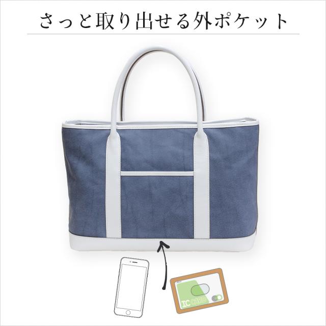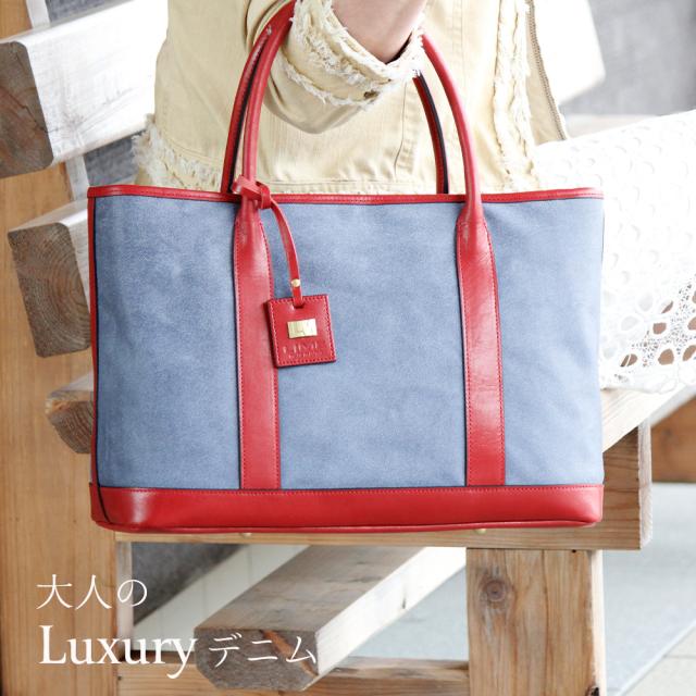 ザクザクと収納できるトートスタイルで、本革ならではの質感と高級感で、大人リッチなカジュアルを演出できるラグジュアリーな『デニム』本革バッグです。