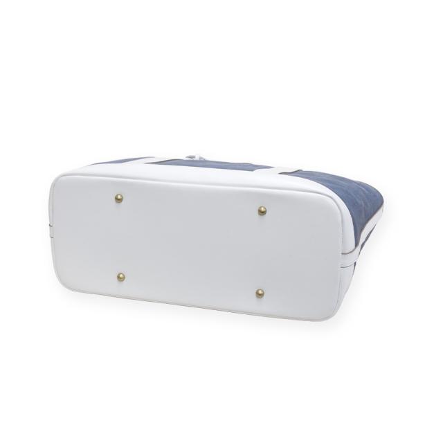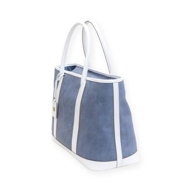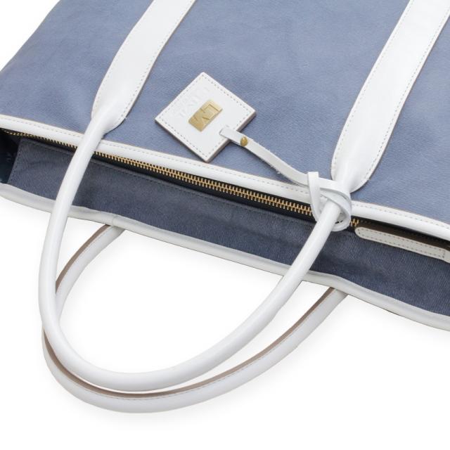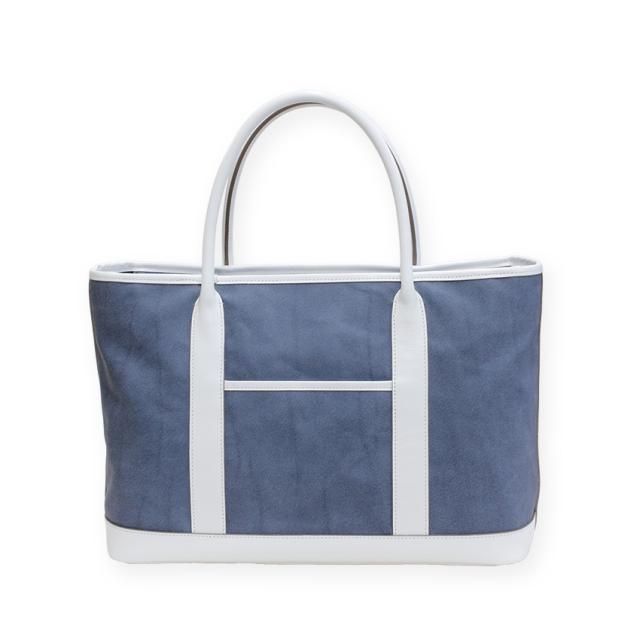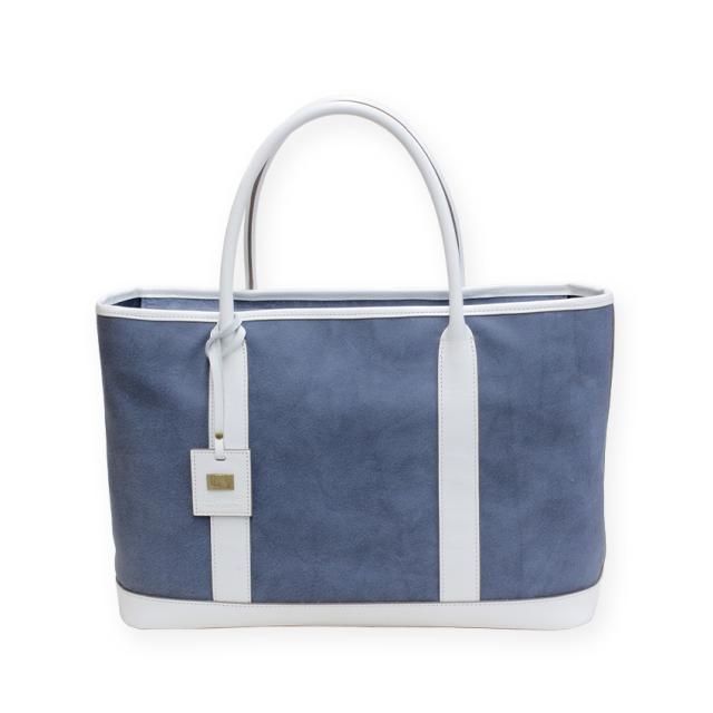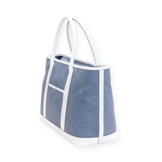 デニム調革素材のお色はどこから見てもデニム生地に見える程、ライトジーンズの薄色デニム感がしっとり表現されたマットなライトブルーカラーの本革トートバッグです。