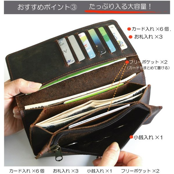 大容量構造により、札入れ・小銭入れ・カードポケットを多数備え、整理しやすく使い勝手良好。