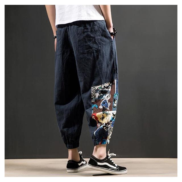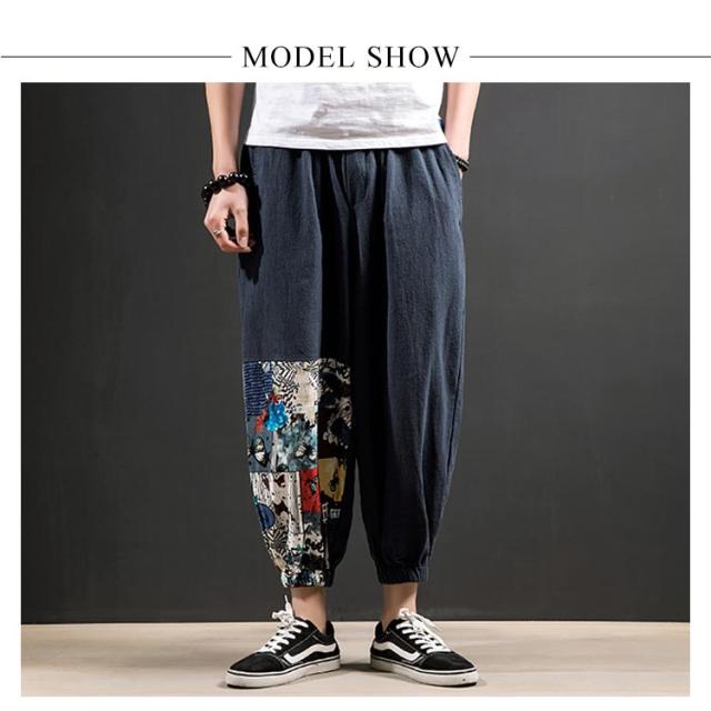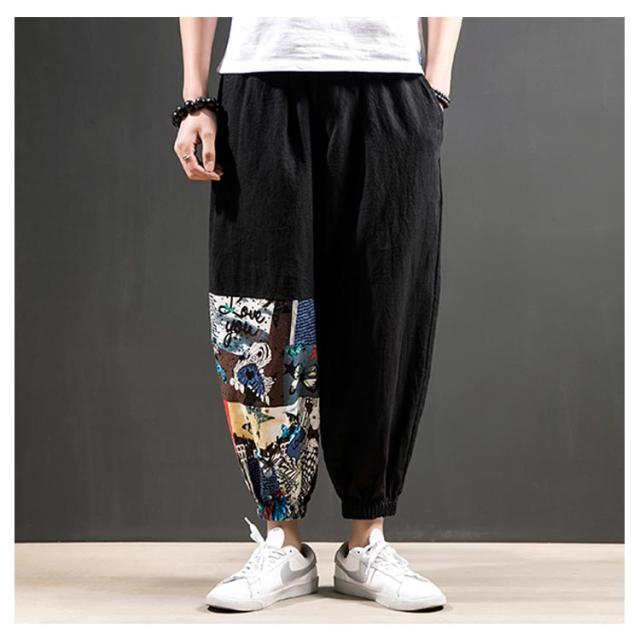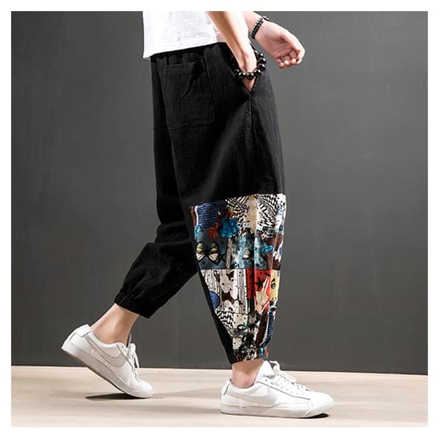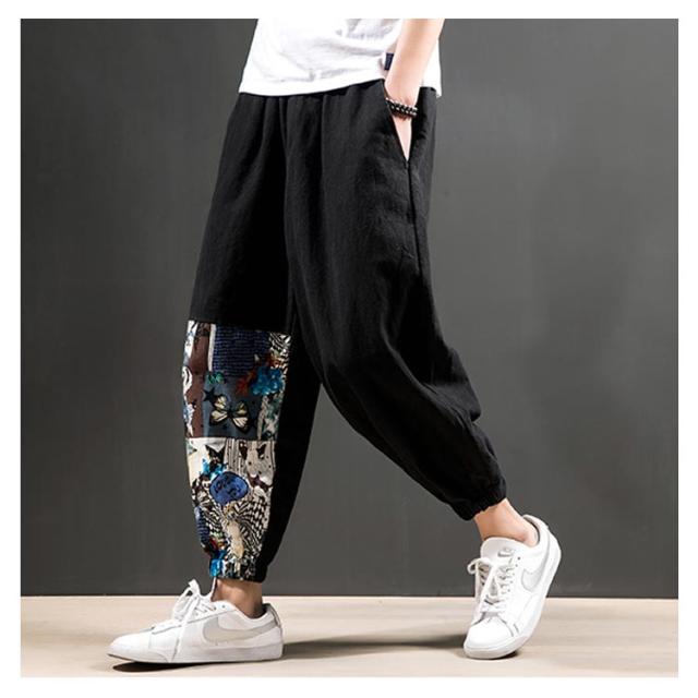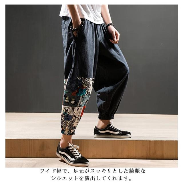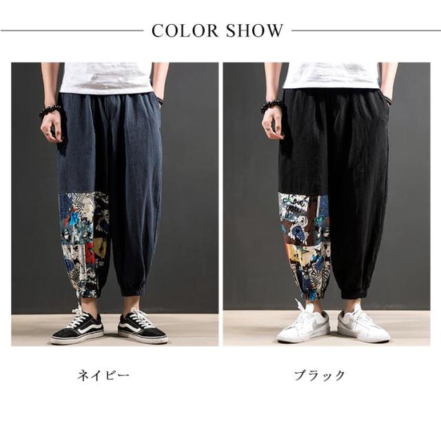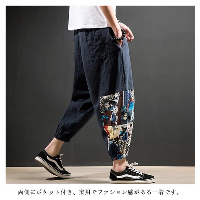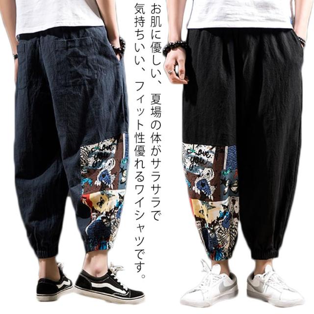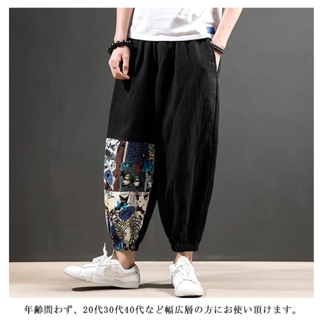プリント切り替え サルエルパンツ 九分丈 メンズ 麻 イージパンツ リネンパンツ 綿 ボトムス 大きいサイズ リラックス 体型カバー 春 夏 秋 海 旅行 M-5XL