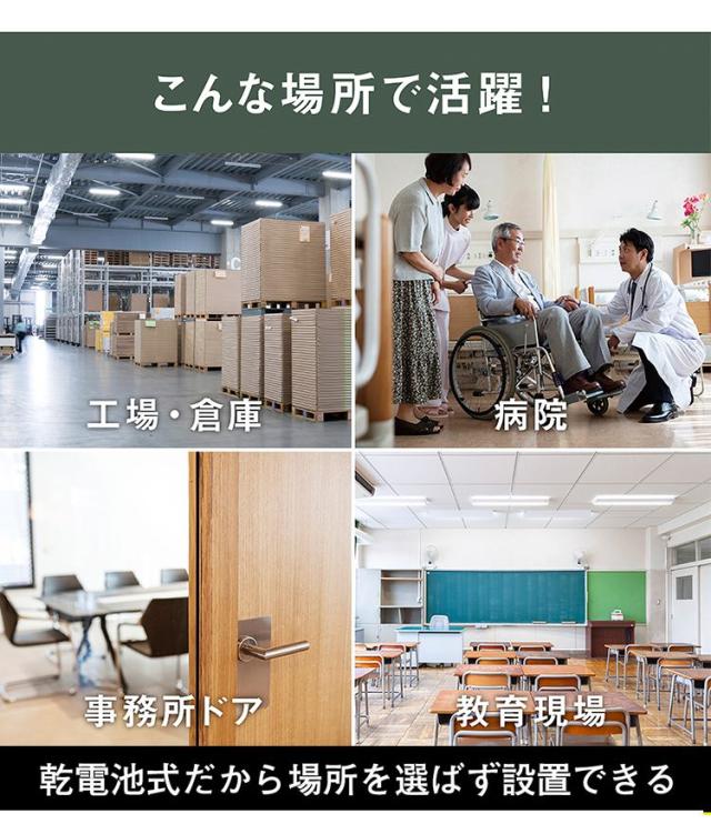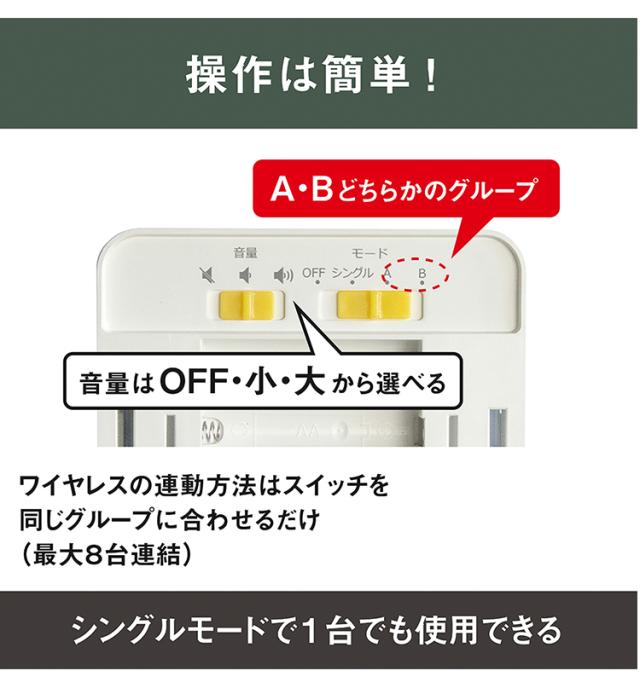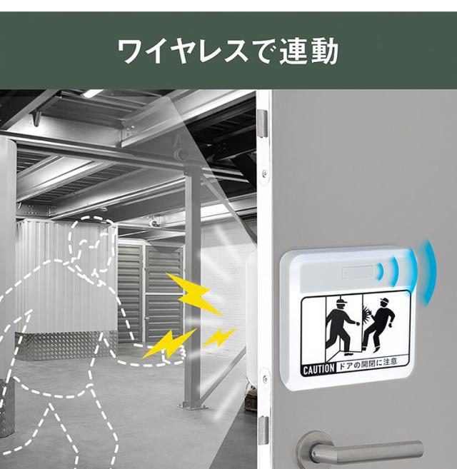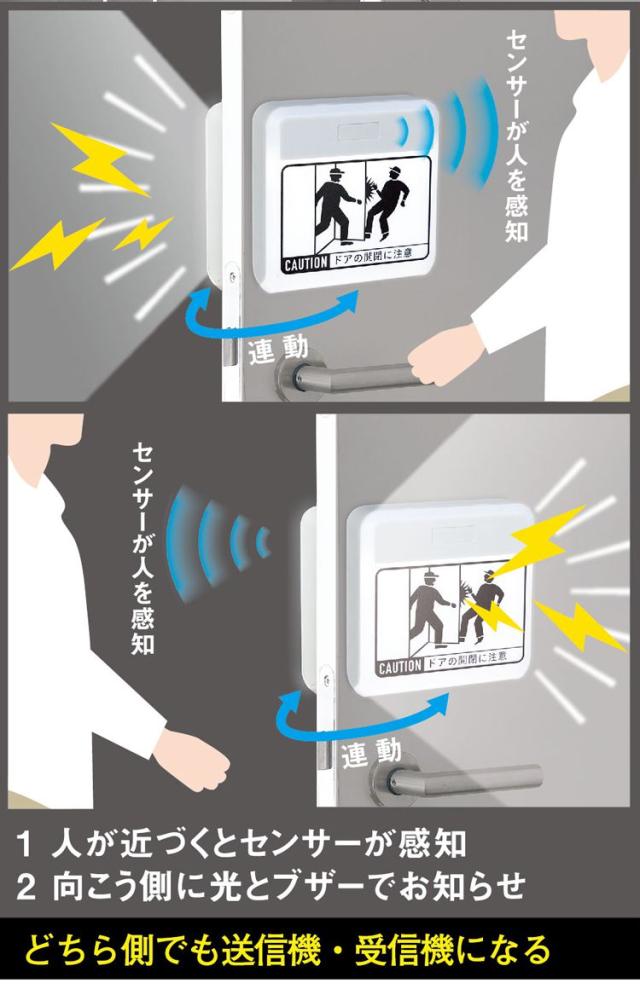 光と音で警告!ドア開閉・曲がり角での激突防止ライト。 ワイヤレスで同時警告!人が近ずくとセンサーが感知、向こう側に光と音でお知らせ。操作は簡単!ワイヤレスの連動方法はスイッチを同じグループに合わせるだけ(最大8台 ワイヤレス連動距離=10m)。
