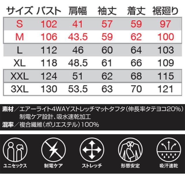 ・素材 : エアーライト4WAYストレッチマットタフタ(伸長率タテヨコ20%)制電ケア設計、吸水速乾加工
