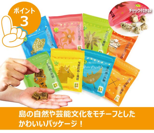 八島黒糖のデザインは、島の自然や芸能文化をモチーフとしたかわいいパッケージとなっています。