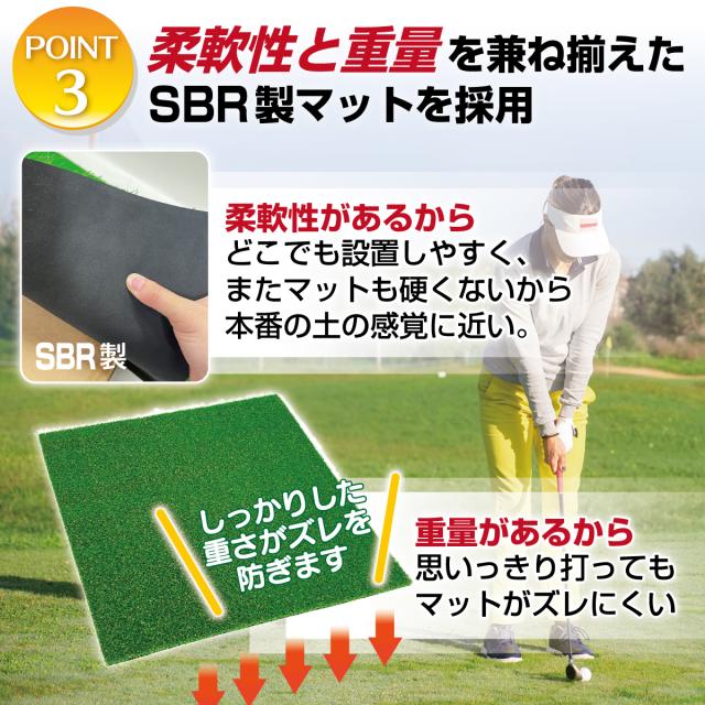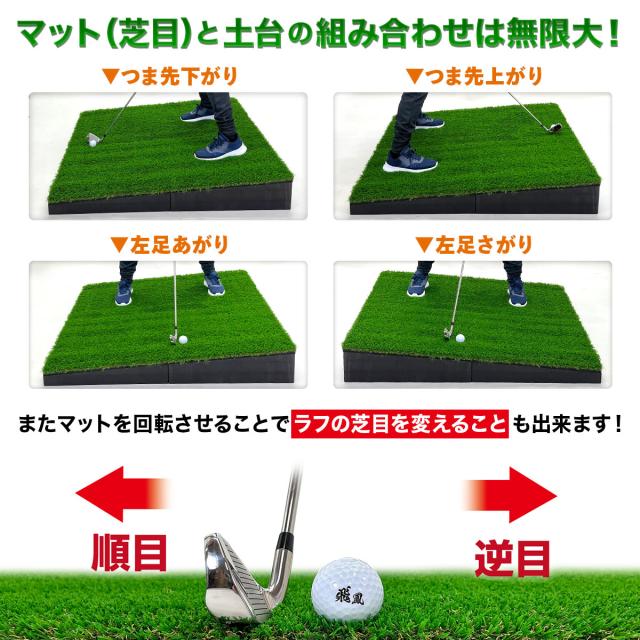 【傾斜で練習できる画期的なゴルフマット】ゴルフコースでは練習場のような平坦な場所はほんどなく、実際は起伏に富んでいて、斜面とラフ芝から如何に距離感を合わせて打ち出せるか、というシチュエーションが多々あります。千差万別のシチュエーション練習に対応できるのが、今回開発した画期的な傾斜用ゴルフマットです。