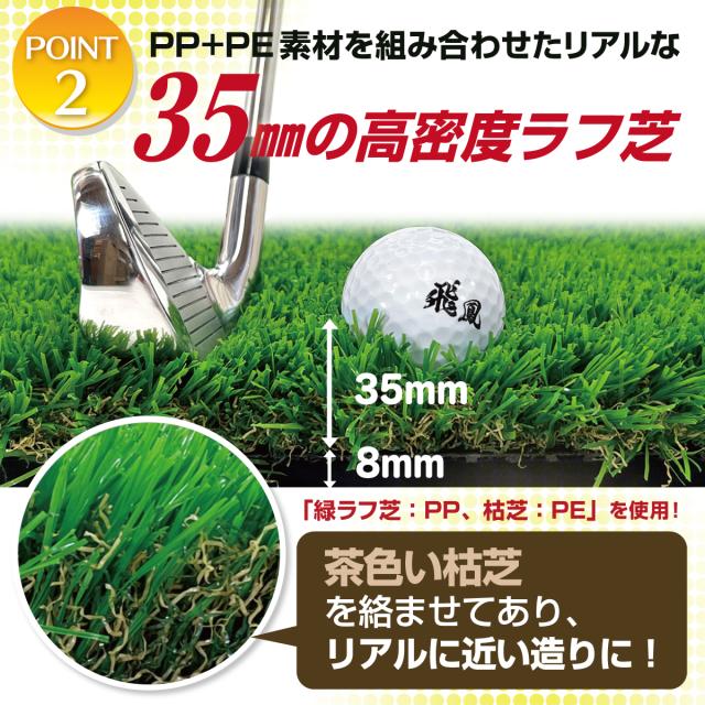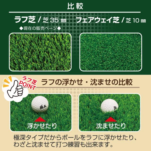 【実際のゴルフ場感覚を追究した人工芝マット】順目と逆目を作り、それを回転させることで様々なシチュエーションを再現できます。例えば、最も難しい左足下がりの深いラフ芝の逆目というシチュエーションも再現できます。芝の材質もPPとPEの混合率を最適化することで、実際のゴルフ場で打つ感覚に限りなく近づけております。