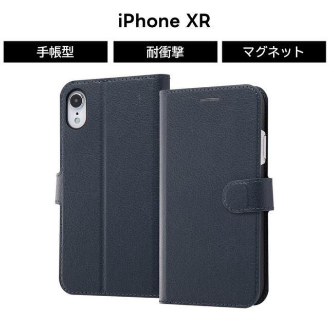 iPhoneXR カバー ケース 手帳型 レザー 革 保護 マグネット シンプル カード入れ ポケット付き スタンド付き 収納 ベルト付き 軽い スマホケース ネイビー