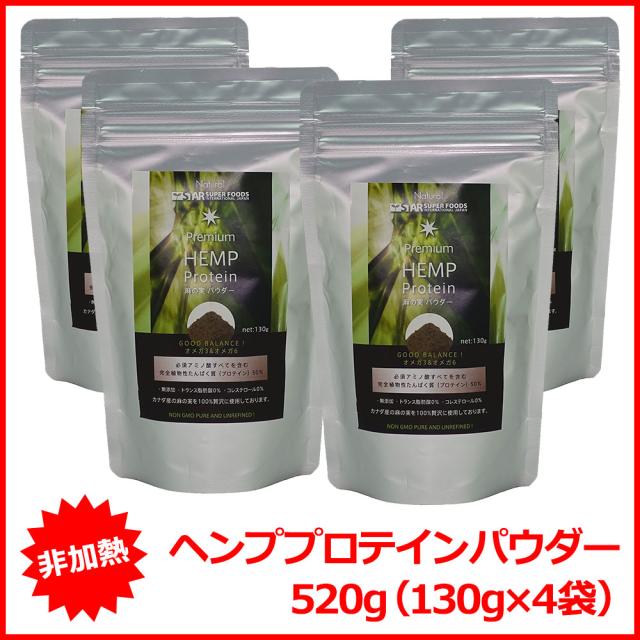 ヘンププロテイン 520g(130g×4) 非加熱 ヘンプパウダー オメガ3 ローフード 健康 ダイエット 美容サポート メール便 送料無料 亜鉛 マグネシウム 鉄 銅 カルシウム等のミネラル 食物繊維が豊富 ダイエット食品 健康食品 美容食品 ヘンプシードプロテイン