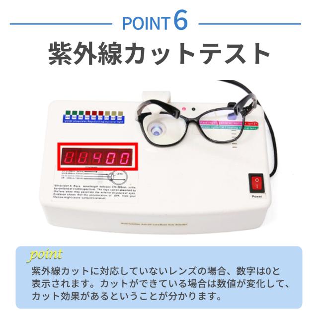 ・紫外線カットに対応していないレンズの場合、数字は0と表示されます。カットができている場合は数値が変化して、カット効果があるということが分かります。