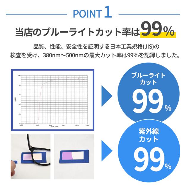 ・品質、性能、安全性を証明する日本工業規格(JIS)の検査を受け、380nm〜500nmの最大カット率は99%を記録しました。