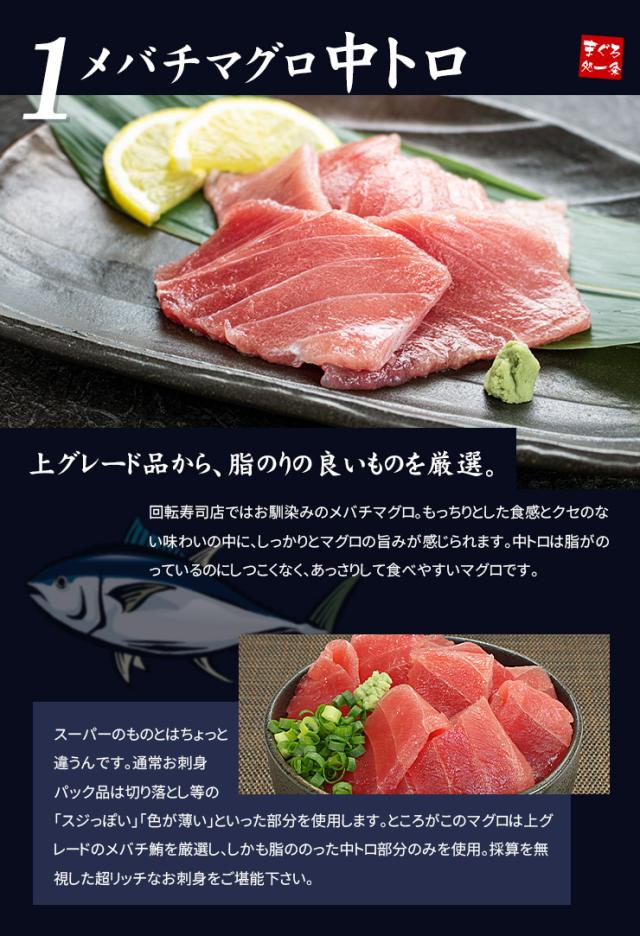 | 産地・原材料 | 目鉢マグロ中トロ:バチまぐろ(産地:日本、台湾、韓国等)、植物油脂、精製魚油/pH調整剤、酸化防止剤(V.C、V.E) ネギトロ:鮪(国産、台湾、その他)、植物油脂、鶏卵、米発酵調味料、食塩/pH調整剤、調味料(アミノ酸等)、酸化防止剤(V.C、V.E)(一部に大豆・卵を含む) ほたて:帆立貝(北海道産) 甘えび:アマエビ(産地:日本、グリーンランド、デンマーク、カナダ、他) |