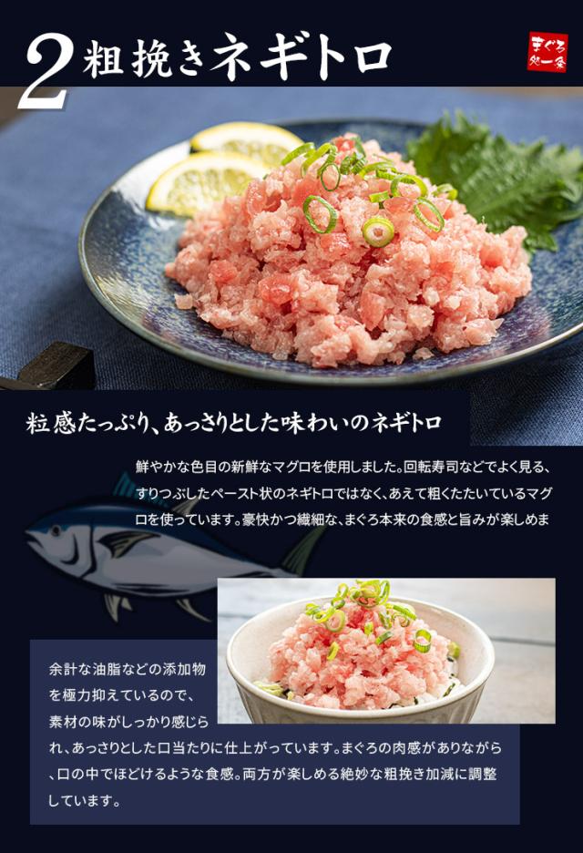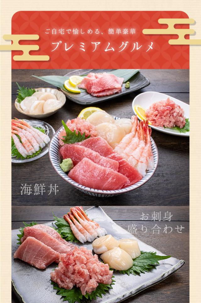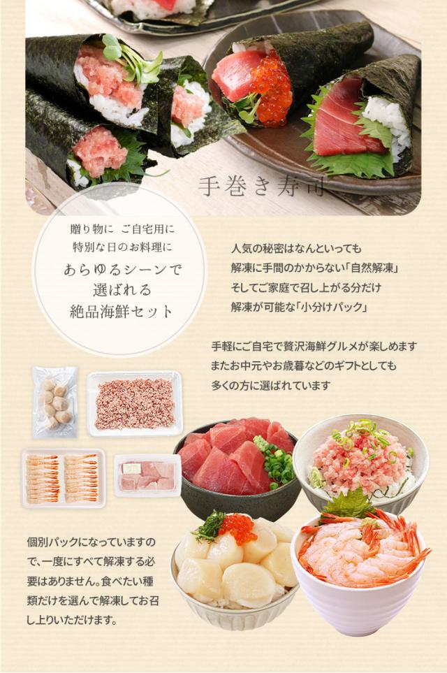 | 内容量 | 目鉢マグロ中トロ100g、粗挽きネギトロ300g、北海道産生ほたて100g(4~8玉)、尾付きむき甘えび20尾 | |||