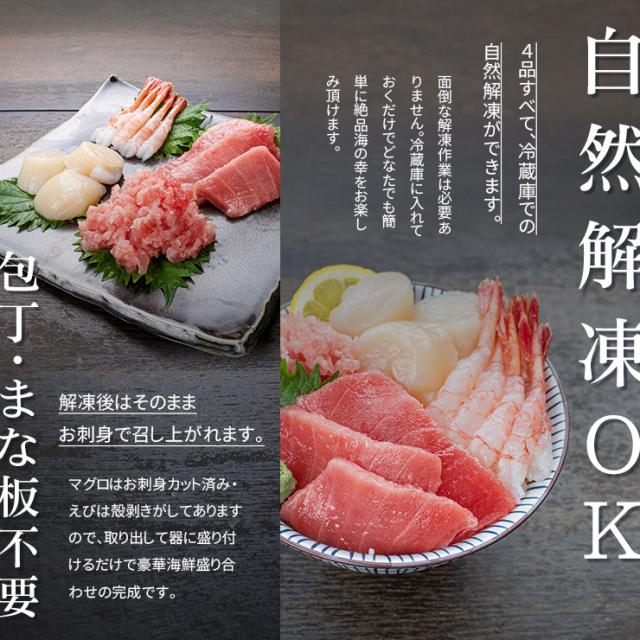 カット済みメバチマグロ中トロ100g、粗挽きネギトロ300g、北海道産生ほたて貝柱100g、尾付きむき甘えび20尾、色々4品、豪華海の幸が一度に楽しめる♪しかもうれしい全品自然解凍対応!包丁まな板不要で贅沢海の幸をご堪能いただけます。