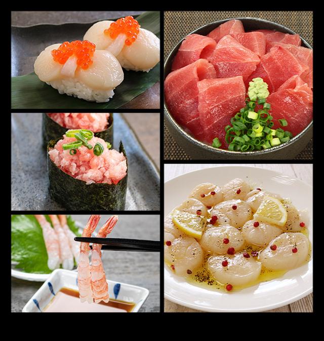 メバチマグロ中トロ、粗挽きネギトロ、北海道産生ほたて貝柱、尾付きむき甘えび