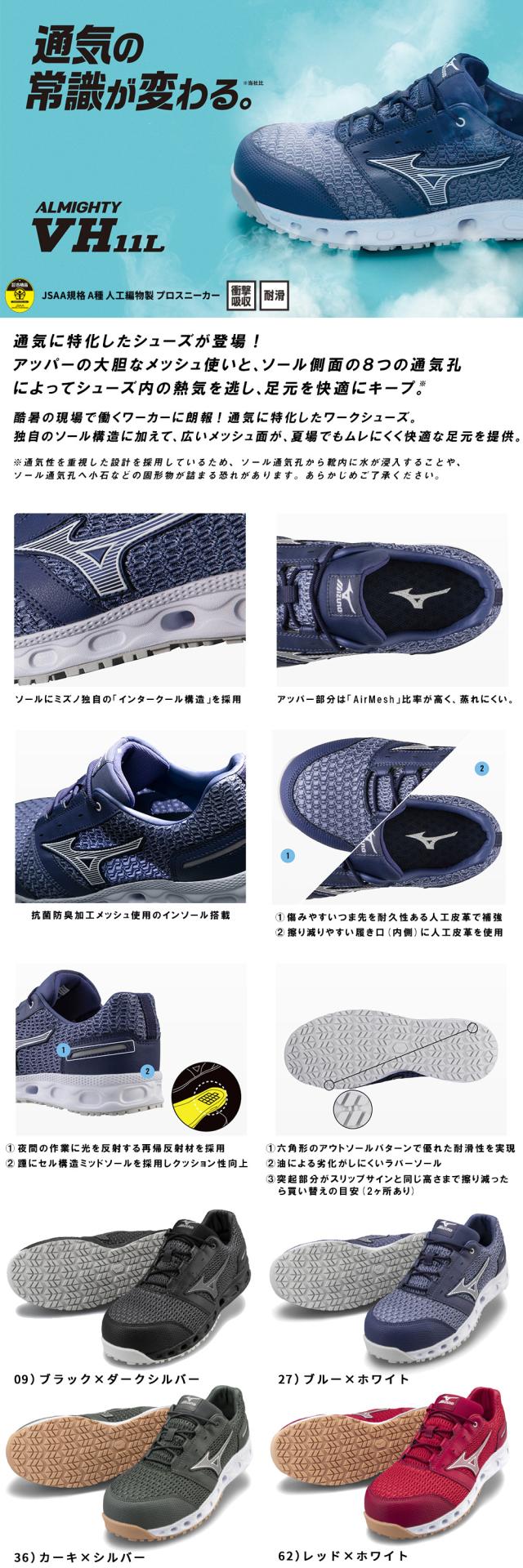 安全靴 ミズノ 新作 2022年 MIZUNO ALMIGHTY VH11L オールマイティ F1GA2204 メンズ レディース 紐靴 JSAA規格 メッシュ 通気性 軽量 樹脂先芯 おしゃれ かっこいい 疲れにくい スニーカー 滑りにくい 建築 建設