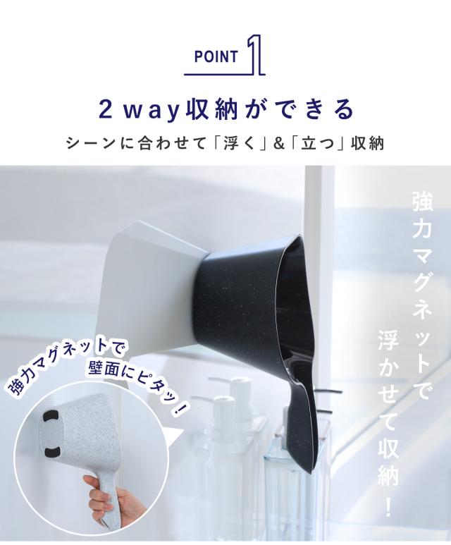 浴室の壁面にマグネットで簡単に取り付けできます。置きっぱなしになりがちな手おけ。浮かせることで水が溜まらず早く乾くため、バスルームを清潔に保てます。