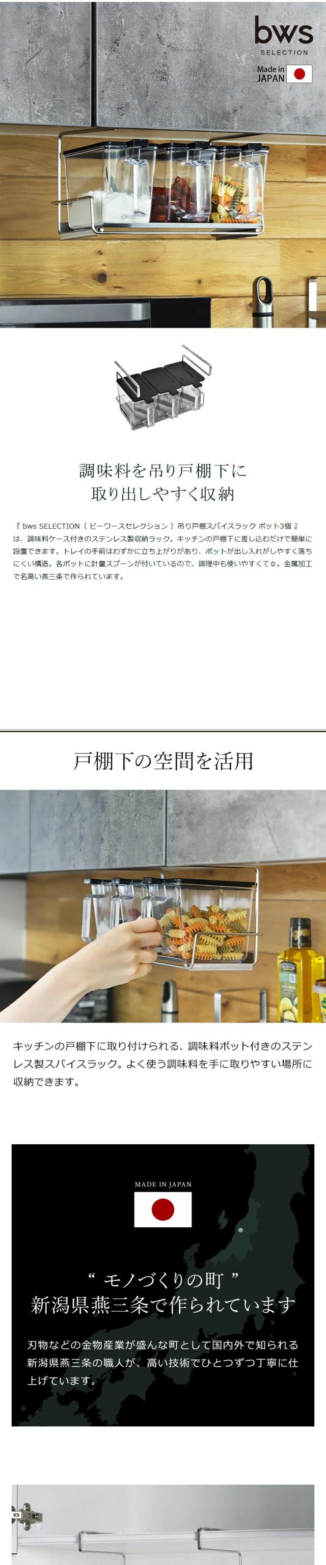『 bws SELECTION( ビーワース セレクション )吊り戸棚スパイスラック ポット3個 』は、調味料ケース付きのステンレス製収納ラック。キッチンの戸棚下に差し込むだけで簡単に設置できます。トレイの手前はわずかに立ち上がりがあり、ポットが出し入れがしやすく落ちにくい構造。各ポットに計量スプーンが付いているので、調理中も使いやすくて◎。金属加工で名高い燕三条で作られています。