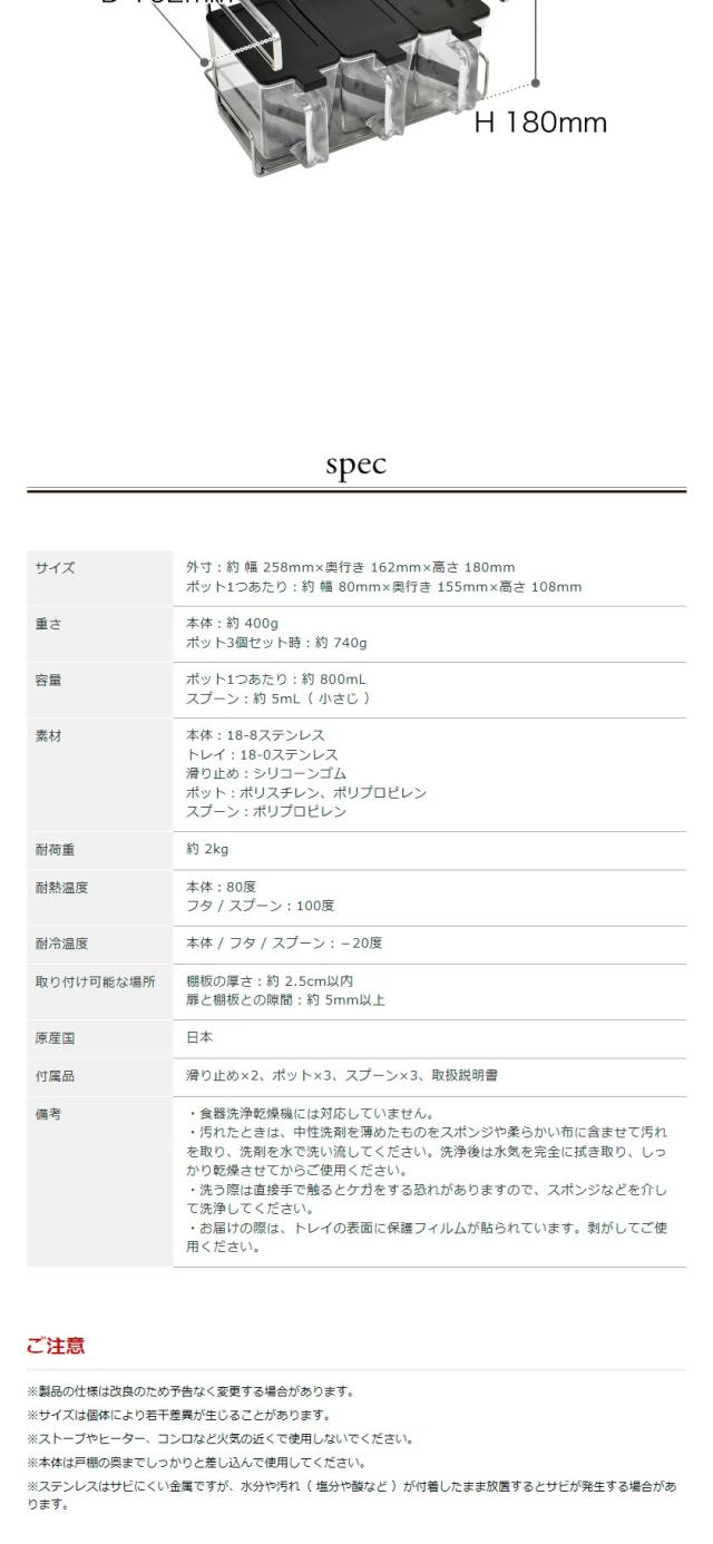ステンレス製のシンプルな調味料ラック。キッチンの吊り戸棚に引っ掛けるだけで簡単に設置でき、調味料ポットが3つ付属していて便利。金属加工で名高い燕三条で作られています。