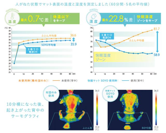 試験方法:人が寝た状態で背中・腰・尻が接する箇所に温湿度センサーをつけて経時的に測定(60分間)。敷布団の上に本商品を使用した場合と、未使用時(敷布団のみ)の場合で比較。