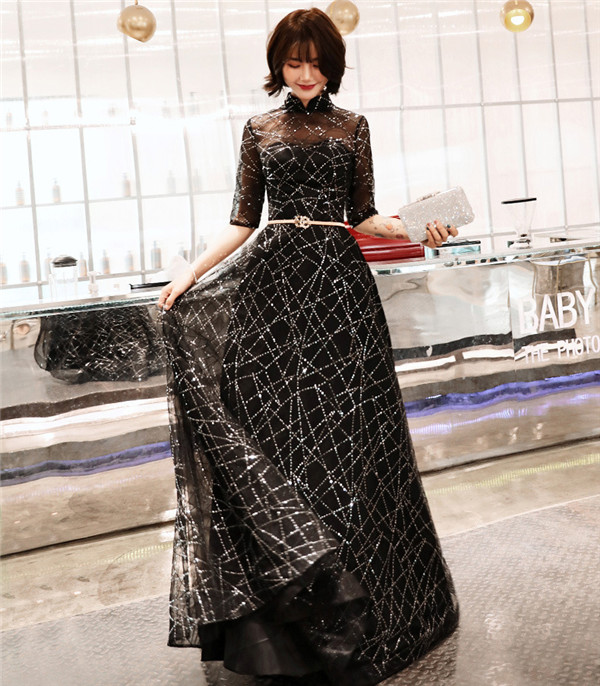【送料無料】キラキラ パーティードレス ロング丈 五分袖 演奏会 キラキラ スパンコールドレス 成人式 同窓会 大人 ピアノ 発表会 演奏会 Aライン 結婚式 ステージドレス 二次会 忘年会 ウエディング ワンピース 上品 20代 30代