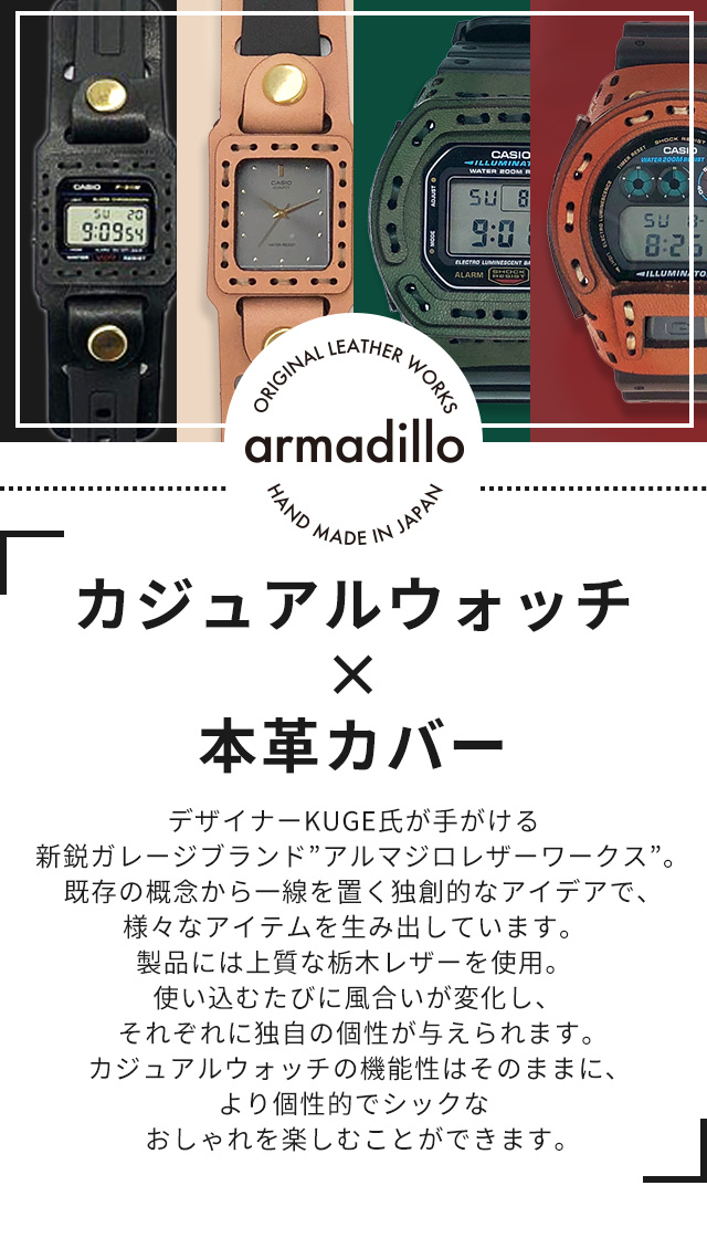アルマジロ DW-6900用レザーケース カスタムベゼル ベゼルカバー G-SHOCK 栃木レザー armadillo 選べるモデル ◆armadillo(アルマジロ)は、デザイナーのKUGE氏が手掛けるガレージブランド。革をメイン素材に、既存製品との意表を突いた組み合わせで完成する不思議なモノ、固定概念にとらわない自由で楽しいモノ造りを目指しています。日本だけでなく海外のセレクトショップでも高く評価されているブランドです。 G-SHOCKの人気モデル、DW-6900に装着できるレザーケース。栃木レザー製タンニンなめしサドルレザーを使い、1つ1つハンドメイドしました。時間を見る度にハイテクウォッチの上で経年変化していく革独特の表情を楽しむことができます。 ダークブラウン ブラック ベージュ レッド グリーン