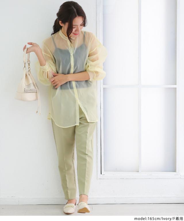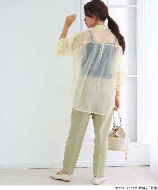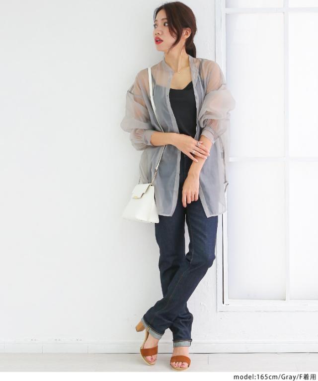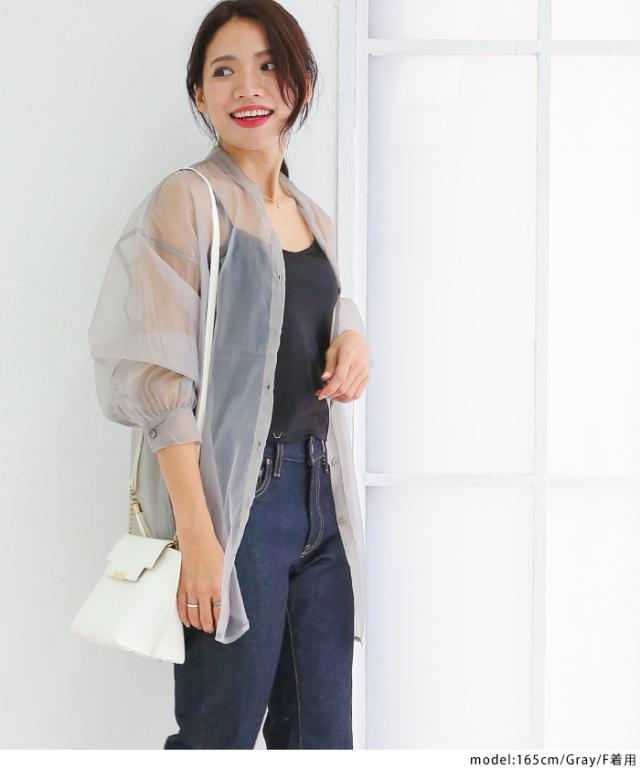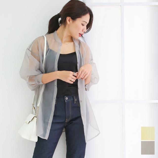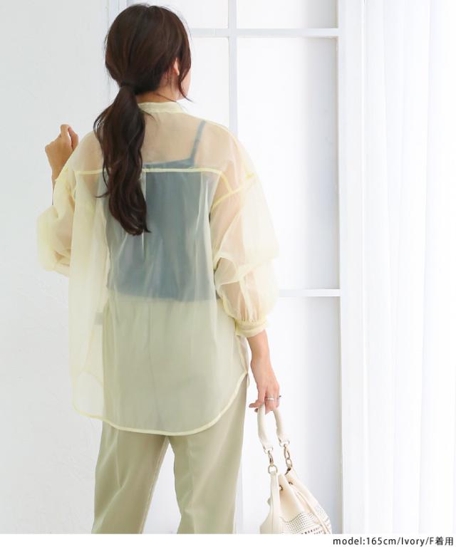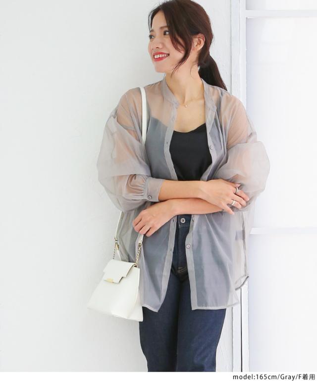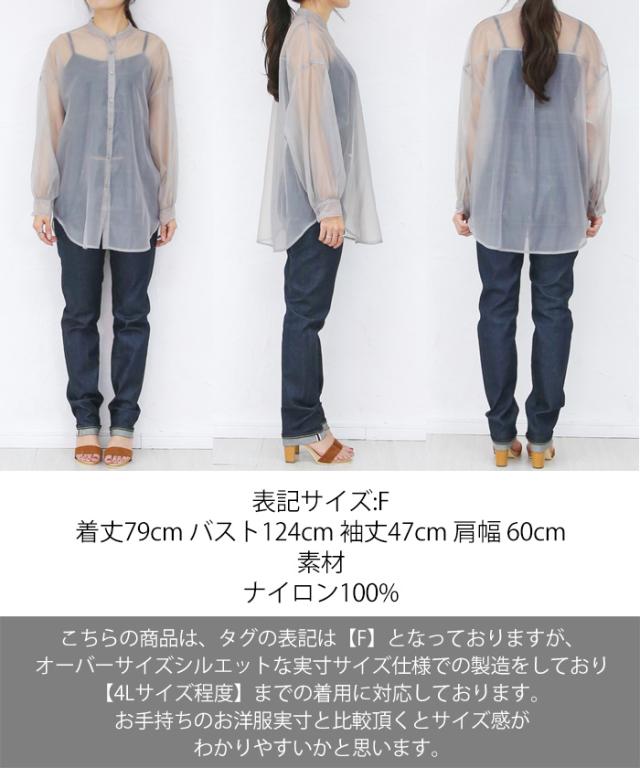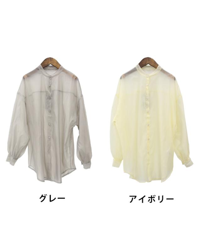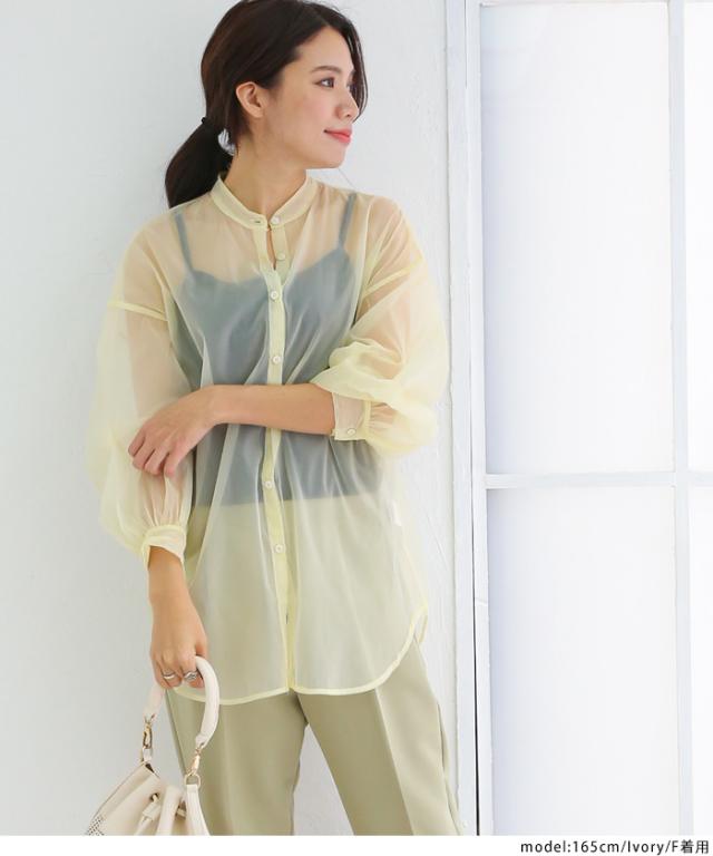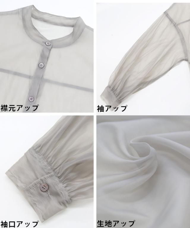 【即納】春新作 大きいサイズ レディース バンドカラー シャツ オーガンジー 五分袖 シースルー トップス バルーンスリーブ 羽織り