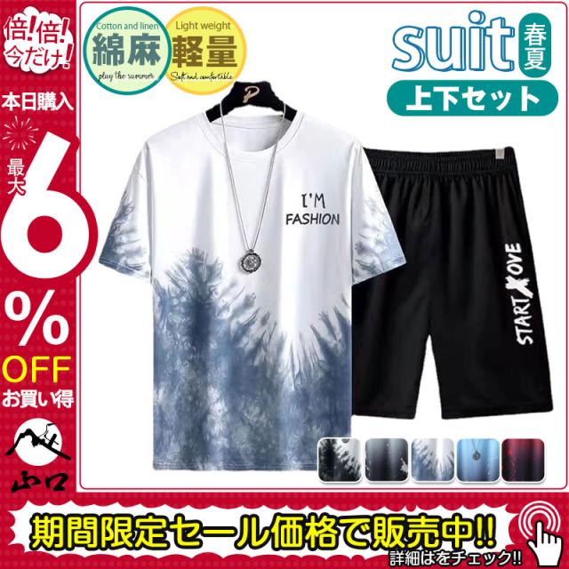 メンズ 半袖上下セット セットアップ カジュアル 夏服 ボトムス 半ズボン 短パン クールネック ジャージ 軽量 柔らか ひんやり