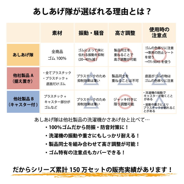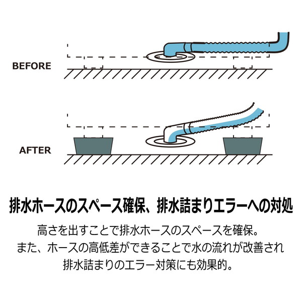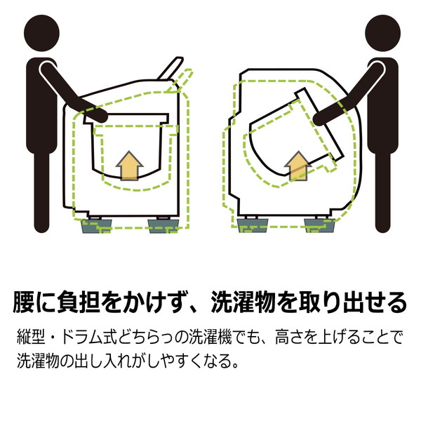 洗濯機の脚の下に敷くことで、25mm(2段重ねで最大50mm)のかさあげが可能。