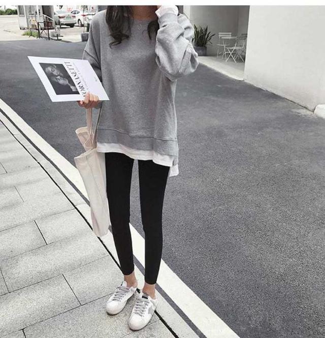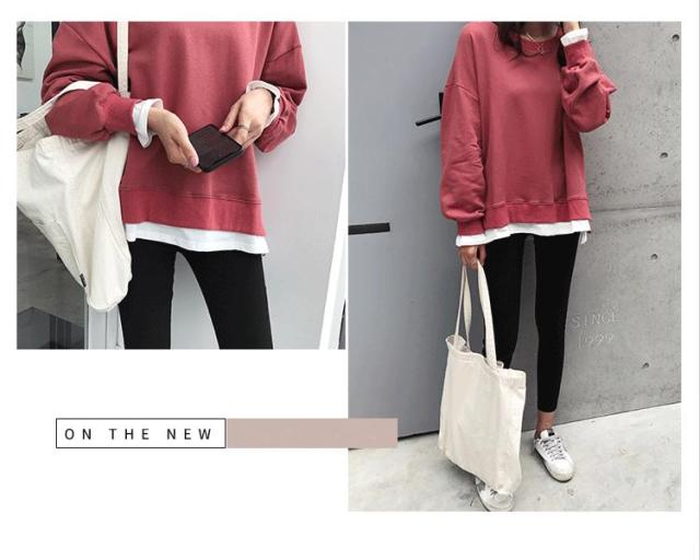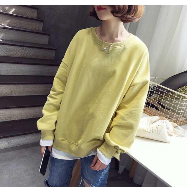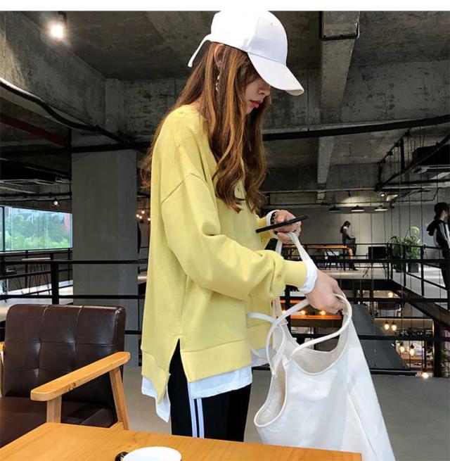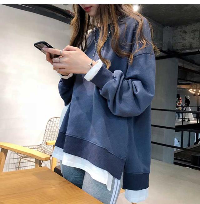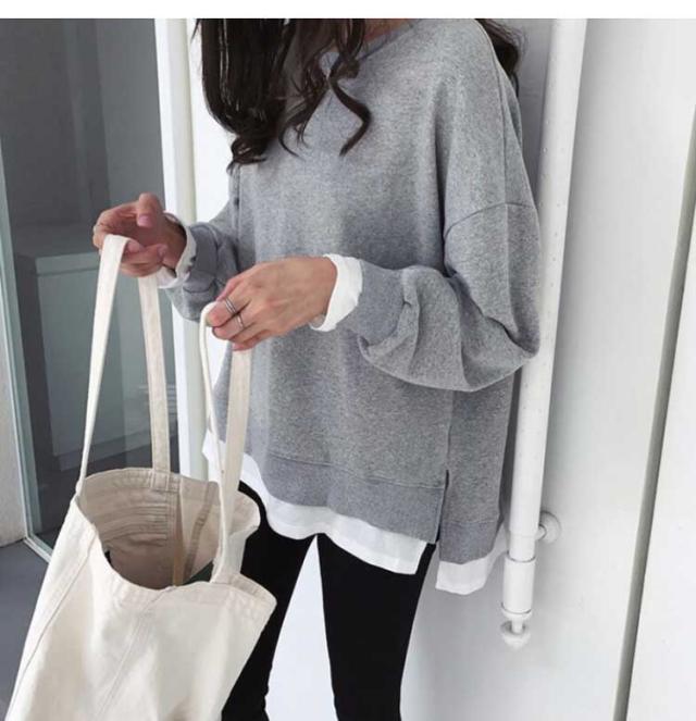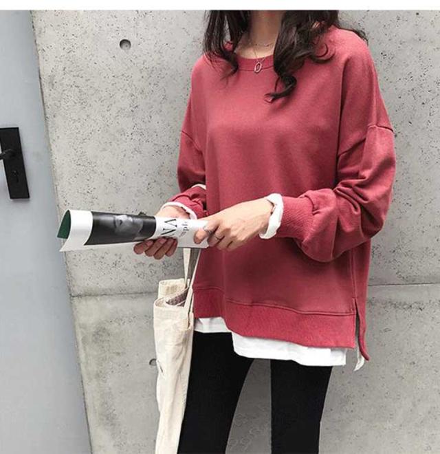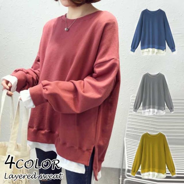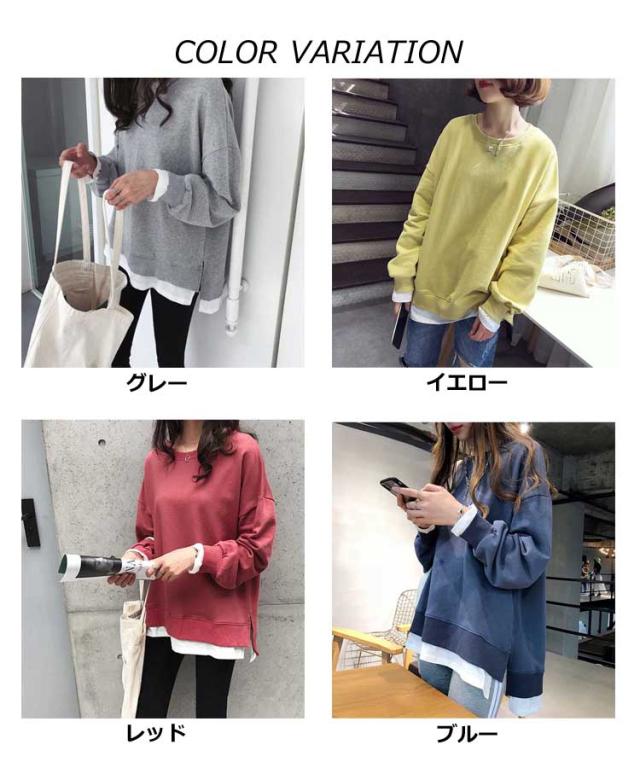 トレーナー レディース 春秋冬 レイヤード ロング丈 ミドル丈 スリット クルーネック 裏起毛 長袖 無地 綿 シンプル 大きいサイズ 全4色 M-4XL
