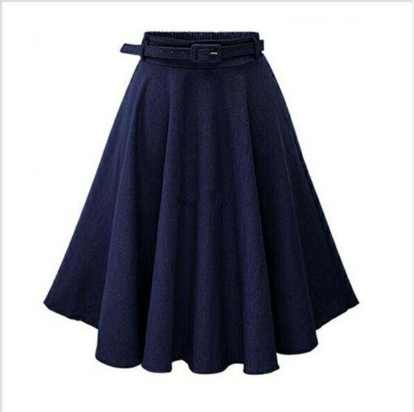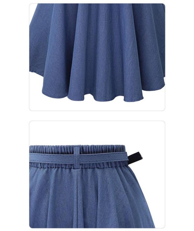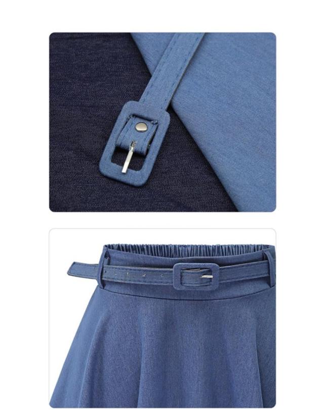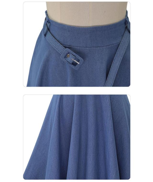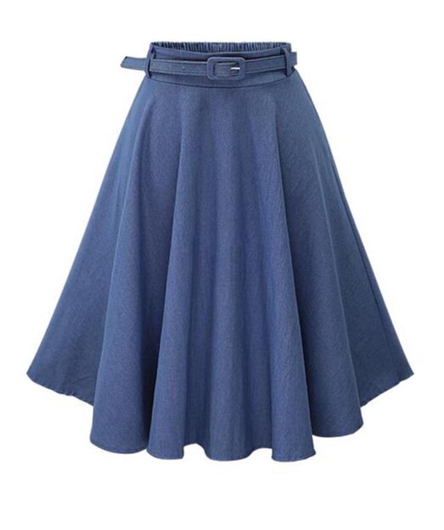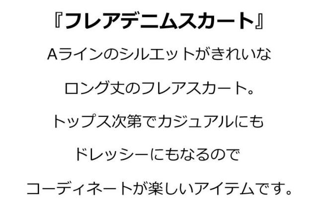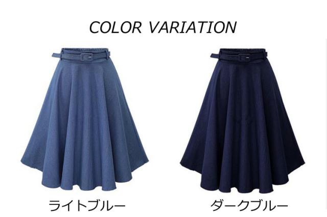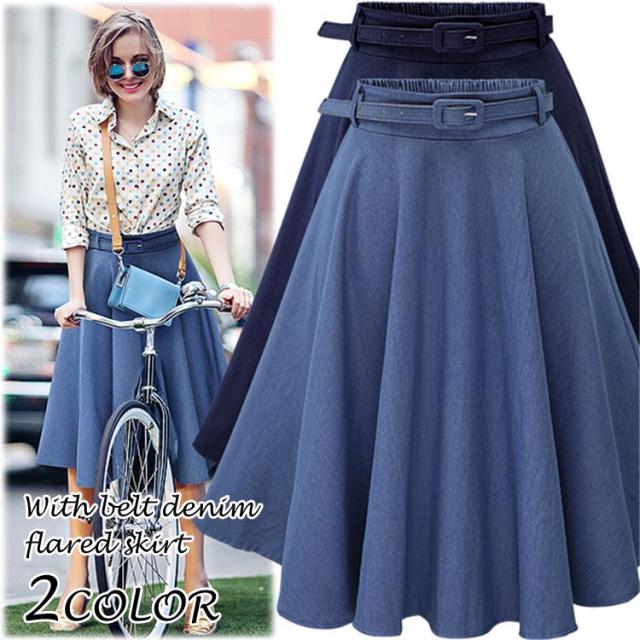 デニムフレアスカート レディース 春夏秋冬 ミモレ丈 ひざ丈 ベルト付き Aライン 無地 きれいめ 全2色 フリーサイズ