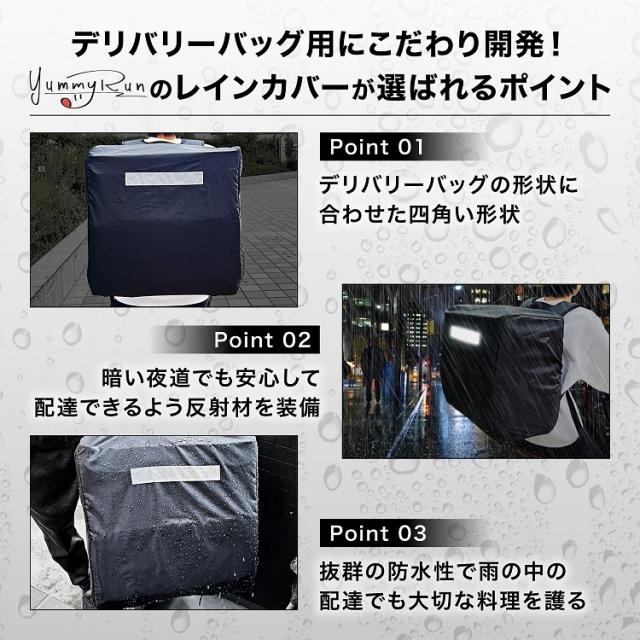 | 商品の説明 | 【素材・適合サイズ】 ポリエステル、ゴム・高さ44cmx横幅46cmx奥行28cmのバッグに最適なレインカバーです。 ※ポケット拡張時には適合しません。 【配達時の大事な料理を雨から守る】 ゴムでリュック全体を包み込むように固定するので、雨から大事な料理を守ります。突然の雨でも簡単に取り付け可能。 【抜群の防水性】 水をかける実験では、レインカバーがしっかりと水を弾いてくれているのが分かります。 雨の中でも抜群の防水性を発揮します。 【リフレクター付きで安心安全】 デリバリーのお仕事では、夜の配達もあり、車などのライトで反射して光るようにリフレクターを背面に装備しました。 暗い夜道も車などからの視認性も抜群です! 【デリバリ—バッグ専用レインカバー】 ウーバーイーツなどの大手宅配会社のバッグに最適なサイズです。お持ちのバッグのサイズをご確認の上、ご購入くださいませ。 |