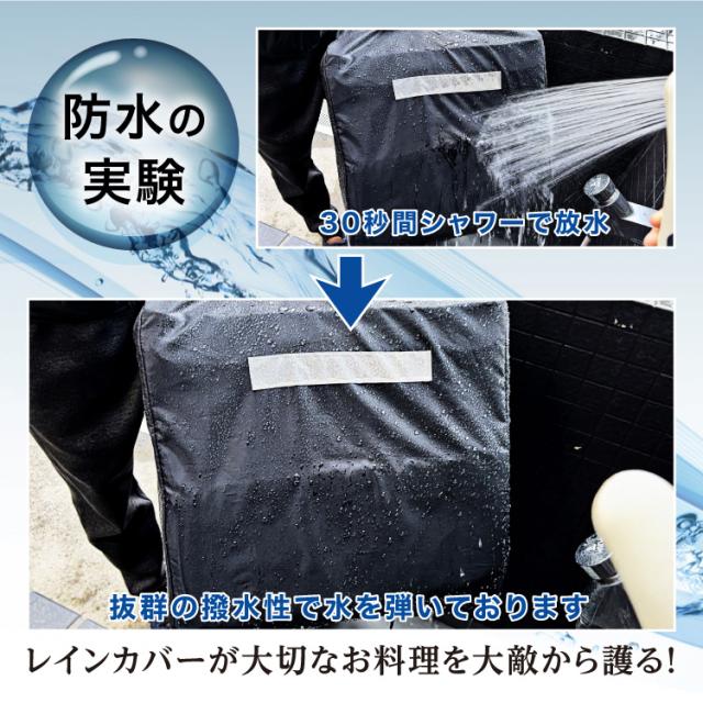 【配達時の大事な料理を雨から守る】 ゴムでリュック全体を包み込むように固定するので、雨から大事な料理を守ります。突然の雨でも簡単に取り付け可能。