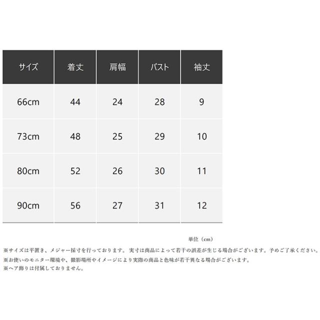 | サイズについての説明 | 【66cm】着丈44cm 肩幅24cm バスト28cm 袖丈9cm 【73cm】着丈48cm 肩幅25cm バスト29cm 袖丈10cm 【80cm】着丈52cm 肩幅26cm バスト30cm 袖丈11cm 【90cm】着丈56cm 肩幅27cm バスト31cm 袖丈12cm ※ヘア飾りは付属しておりません。 |